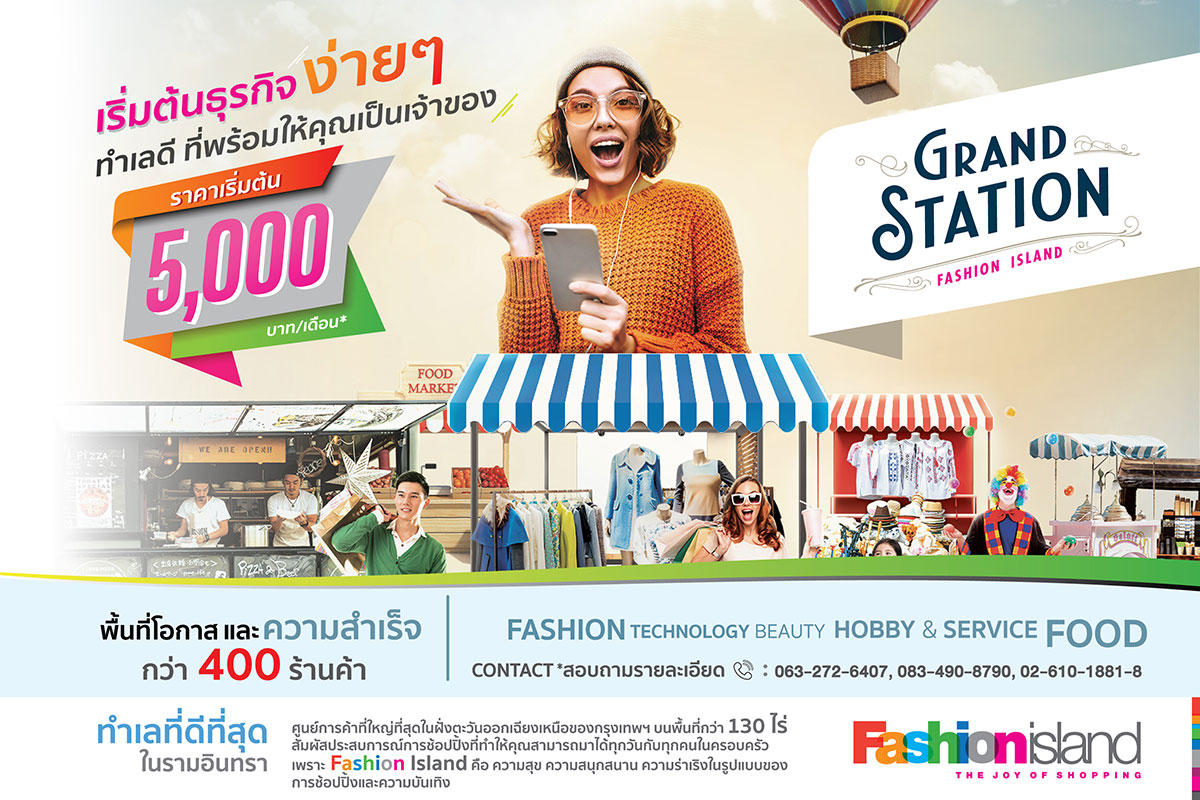 “สถานีแห่งความสุขสำหรับทุกครอบครัวเริ่มต้นที่นี่...Grand Station” ที่แกรนด์สเตชั่น แฟชั่นไอส์แลนด์ คุณจะได้พบกับสินค้าชั้นนำและร้านอาหาร Street Food มากมายกว่า 500 ร้านค้า และบรรยากาศที่สบายๆสไตล์ยุโรปคลาสสิก เปิดประสบการณ์ การช็อปปิ้งรูปแบบใหม่ได้แล้วที่ Grand Station @ Fashionisland