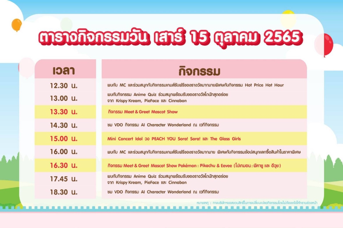 - วันที่ 8 – 9 และ 15 – 16 ต.ค. 65 พบกับ Mascot Show อาทิ Pokemon, Esther Bunny และ Crayon Shin Chan