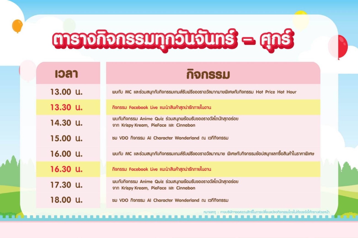 - ทุกวันเสาร์ และ อาทิตย์ รับฟรี!! ลูกโป่งหลากสีสัน เอาใจคุณหนู ๆ ตลอดทั้งวัน