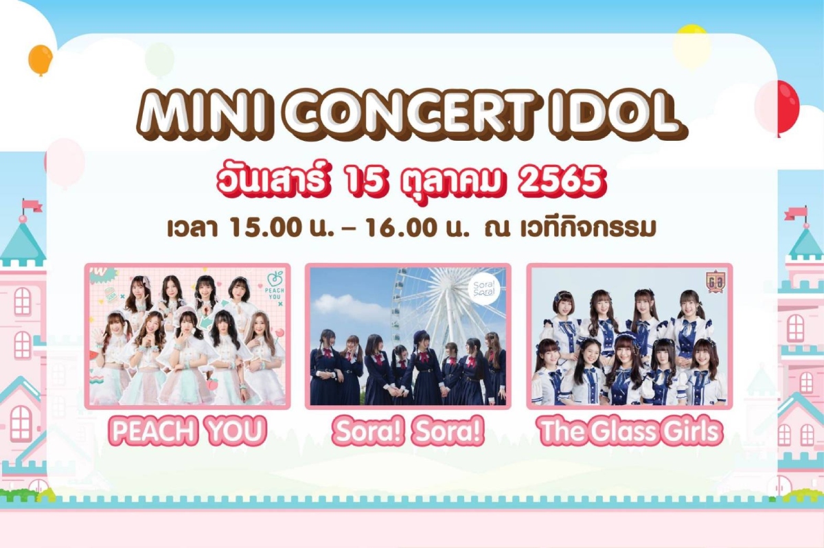- วันที่ 15 – 16 ต.ค. 65 พบกับ Mini Concert Idol สุดน่ารักจากสาว ๆ วง PESCH YOU, Sora! Sora!, The Glass Girls, Bizcuit, KAIBUTSU และ RELIVESEKAI