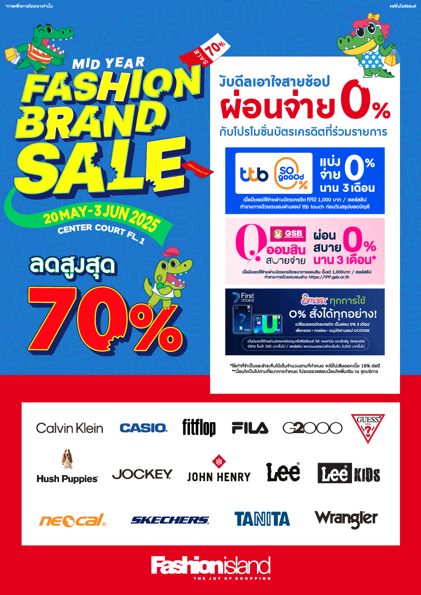 Fashionisland 20 พ.ค. – 3 มิ.ย. 68 #MidYearFashionBrandSale ชวนคุณมาช้อปแฟชั่นแบรนด์ดัง ลดกระหน่ำสนั่นกลางปีสูงสุด 70% จัดหนักทุกไอเทม จัดเต็มทุกแบรนด์ อาทิ Calvin Klein, CASIO, Fitflop, FILA, G2000, GUESS, Hush Pupies, JOCKEY, JOHN HENRY, Lee, Lee kids, Neocal, SKECHERS, TANITA, Wrangler