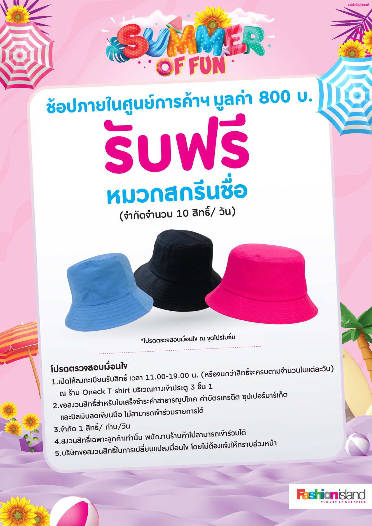 - ช้อปภายในศูนย์การค้าฯ มูลค่า 800 บาท รับฟรี หมวกสกรีนชื่อสุดคิ้วท์