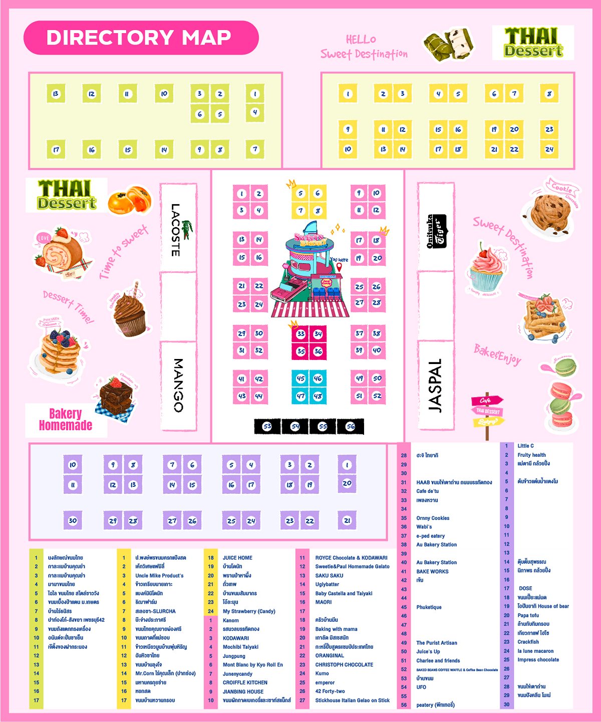 และนอกจากนี้ยังมีร้านดังอีกกว่า 100 ร้านค้า อาทิ White Story การันตีความอร่อยกว่า 15 ปี, JIAN BING ต้นตำรับเครปสไตล์จีน, Bake my day ต้นตำรับเมนูฮิต สูตรออริจินัล, Mont Blanc เมนูสุดฮิตในญี่ปุ่น, Stickhouse ไอศกรีมเจลาโต้แบบแท่งแบรนด์ดังจากอิตาลี, Sweetie and Paul เจลาโต้ที่มีเรื่องเล่าจากสุดยอดวัตถุดิบ, Baking with Mama ร้านเค้กหน้านิ่มของ “น้ำชา ชีรณัฐ”, Ornny’s Cookies Soft Cookies เจ้าดังย่ายเอกมัย, Au Bakery Station เบเกอรี่โฮมเมด ย่านอุดมสุข, และอีกมากมาย