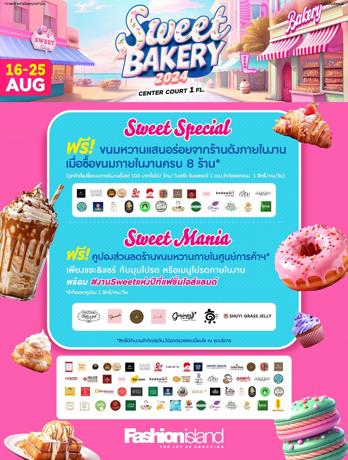 - รับฟรีคูปองส่วนลดร้านขนมหวานภายในศูนย์การค้าฯ* เพียงแชะ & แชร์ กับมุมโปรด หรือเมนูโปรดภายในงาน พร้อม #งานSweetแห่งปีที่แฟชั่นไอส์แลนด์ (จำกัดแลกคูปอง 1 สิทธิ์/ คน/ วัน)