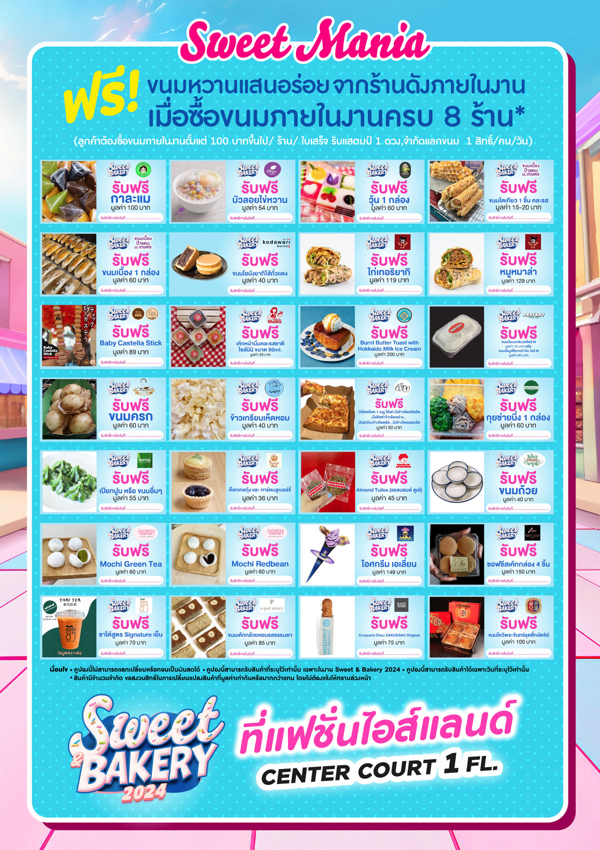 - รับฟรีขนมหวานแสนอร่อยจากร้านดังภายในงาน เมื่อซื้อขนมภายในงานครบ 8 ร้าน* (ลูกค้าต้องซื้อขนมภายในงานร้านละ 100 บาทขึ้นไป/ ร้าน/ ใบเสร็จ รับแสตมป์ 1 ดวง, จำกัดแลกขนม 1 สิทธิ์/ คน/ วัน)