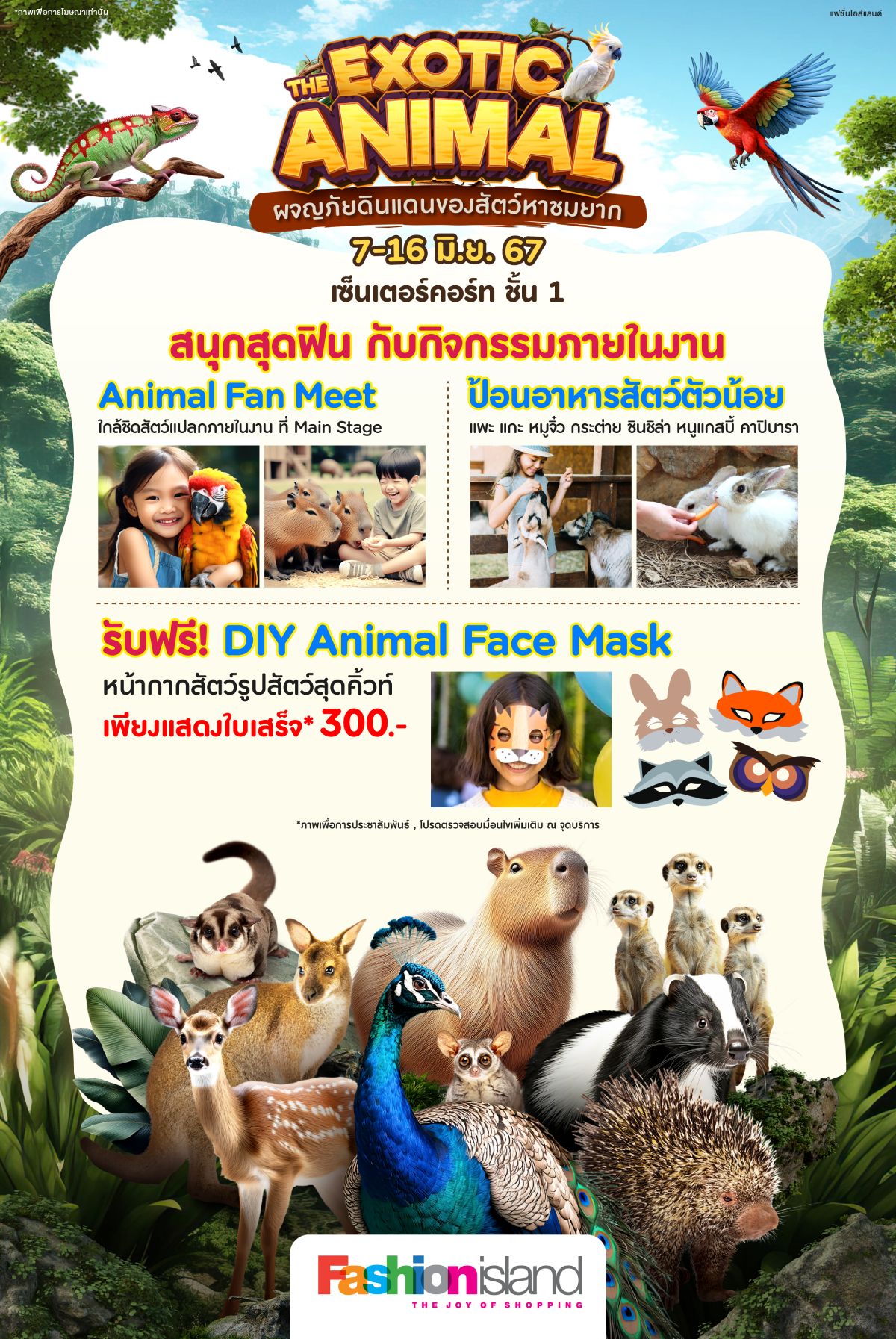 7 – 16 มิ.ย. นี้ Fashionisland เตรียมเปิดโลกมหัศจรรย์สุดอลังการ ผจญภัยในดินแดนของสัตว์หาชมยาก ในงาน #TheExoticAnimal อาทิ คาปิบาราจอมมึน, กวางซิก้า, นกยูงอินเดียน, นกคัสซัววารี่, จิ้งโจ้แคระ, งูสายพันธุ์ต่าง ๆ, คาเมเลี่ยน, เบียดดราก้อน และอื่น ๆ มากกว่า 50 ชนิด ร่วม Animal Fan Meet สัตว์แปลก และป้อนอาหารสัตว์กับอย่างใกล้ชิด
