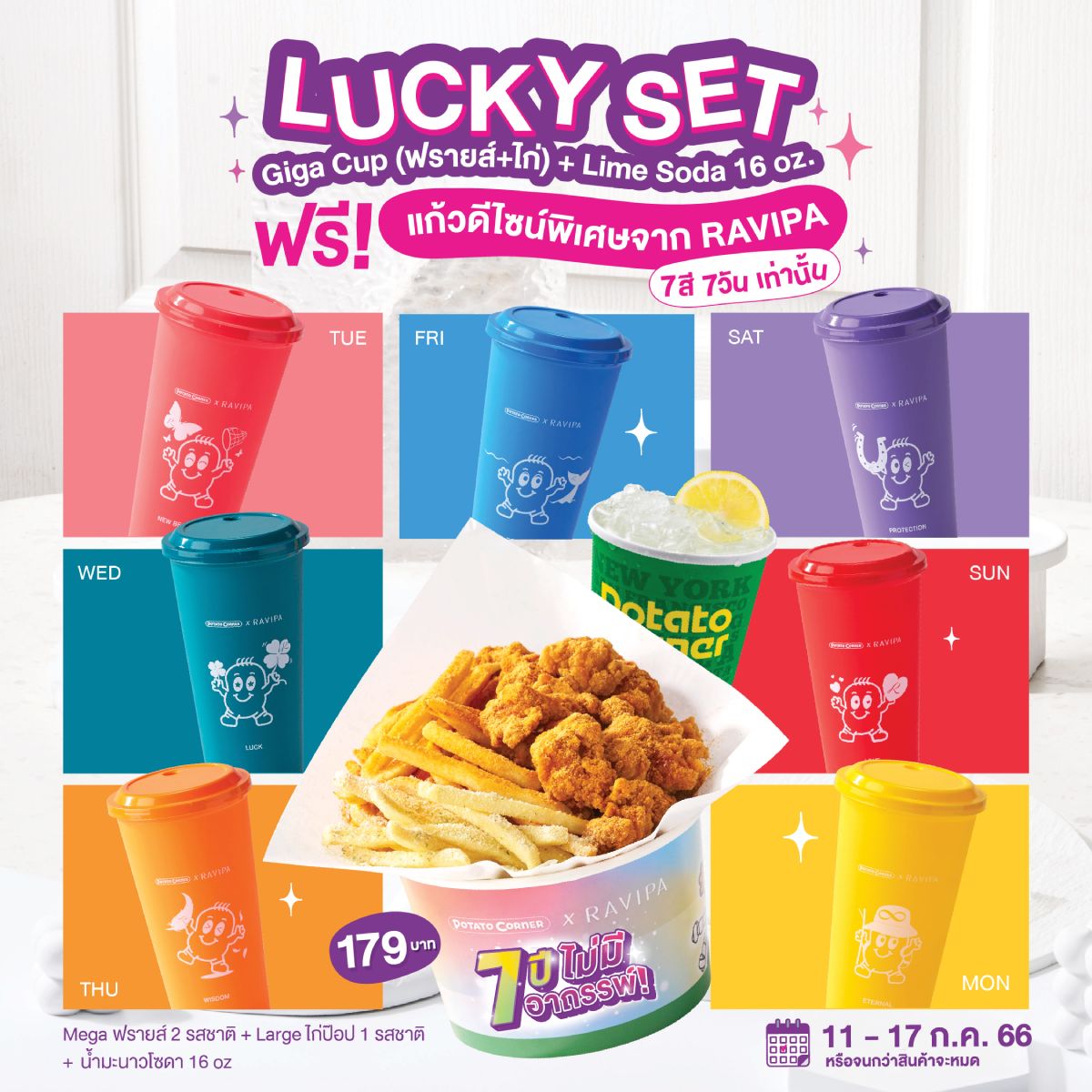 แค่สั่ง Lucky Set ก็ได้รับแก้วฟรี! ใครชอบสีไหน ความหมายไหน ปักวันไว้แล้วไปจัดกันเลยฮะ ในเซตจะมี Lucky Giga Cup (Mega ฟรายส์ 2 รสชาติ + Large ไก่ซุปเปอร์ป๊อป 1 รสชาติ) คู่มะนาวโซดา 16 oz เพียง 179 บาท