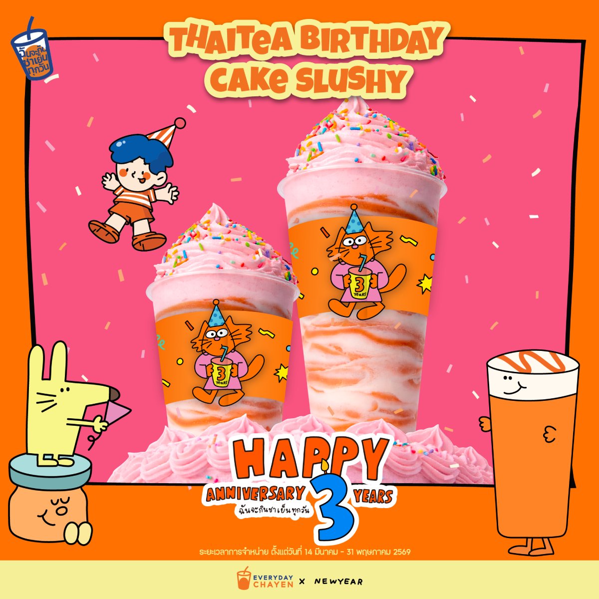 ครบรอบ 3 ปี “ฉันจะกินชาเย็นทุกวัน” พบกับเมนูพิเศษ THAITEA BIRTHDAY CAKE SLUSHY รสชาติที่ไม่เคยทำมาก่อน หวานมันของชาเย็น ตัดด้วยความเปรี้ยวของเลม่อนครีมชีส สายชาเย็นห้ามพลาด บอกเลยว่าฟินตลอดทั้งเดือน