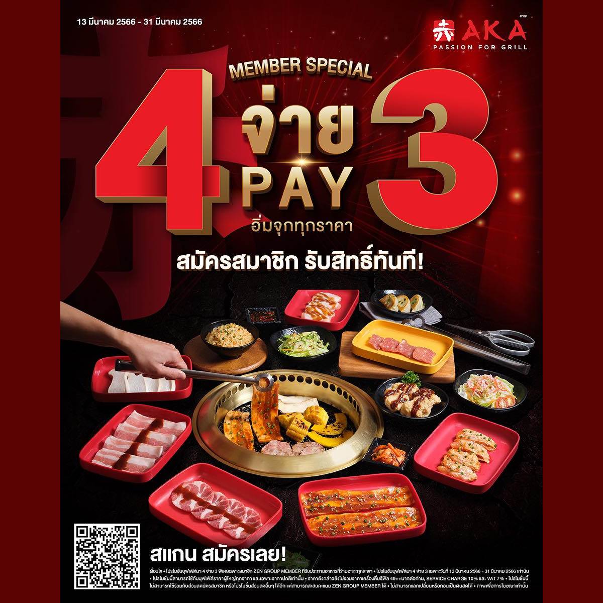 - โปรโมชั่นบุฟเฟ่ต์มา 4 จ่าย 3 พิเศษฉพาะสมาชิก ZEN Group Member ที่รับประทานอาหารที่ อากะ ทุกสาขา