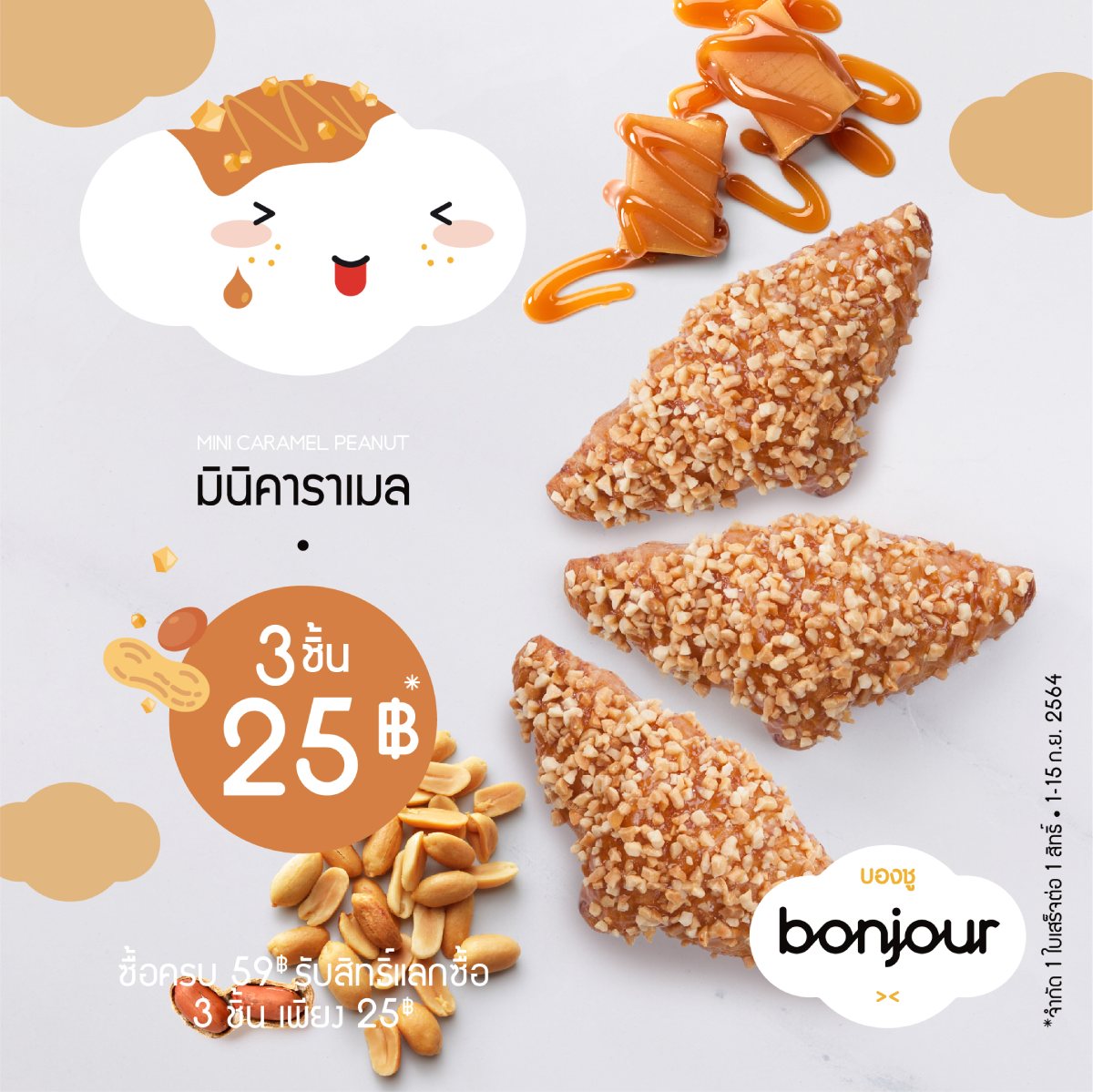 โปรโมชั่น แลกซื้อมินิคาราเมล ในราคา 3 ชิ้น 25 บาท เพียงซื้อขนมบองชูครบ 59 บาท เท่านั้น (1ใบเสร็จ/1สิทธิ์)