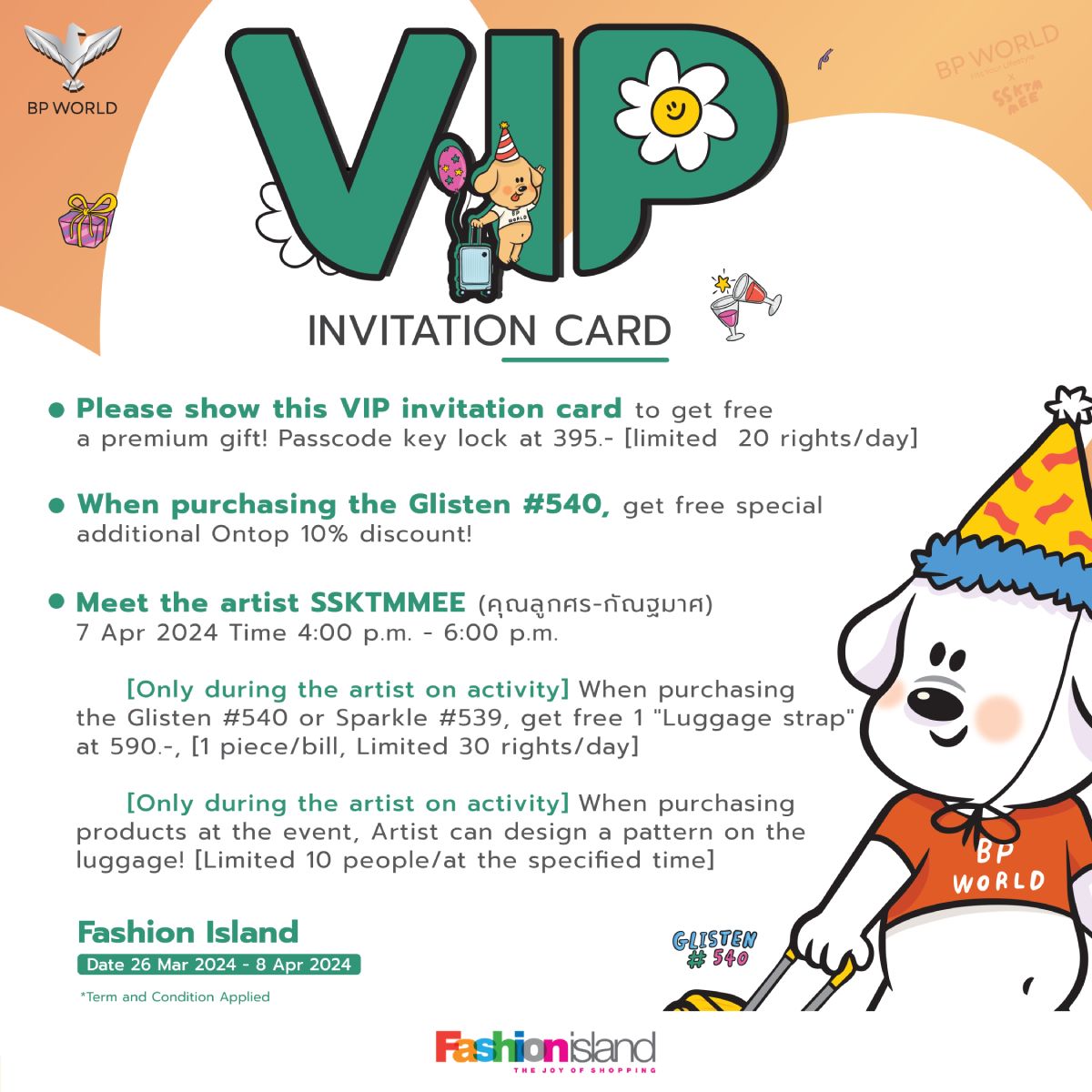- พิเศษเฉพาะวันเสาร์-อาทิตย์ เมื่อคุณลูกค้าแสดง VIP Invitation Card รับสิทธิพิเศษ! เมื่อซื้อกระเป๋าเดินทางรุ่นใด ไซส์ใดก็ได้ 1 ชิ้น รับฟรี! สายรัดกระเป๋าเดินทาง มูลค่า 590 บาท 1 ชิ้น ที่ออกแบบโดยศิลปิน ssktmmee