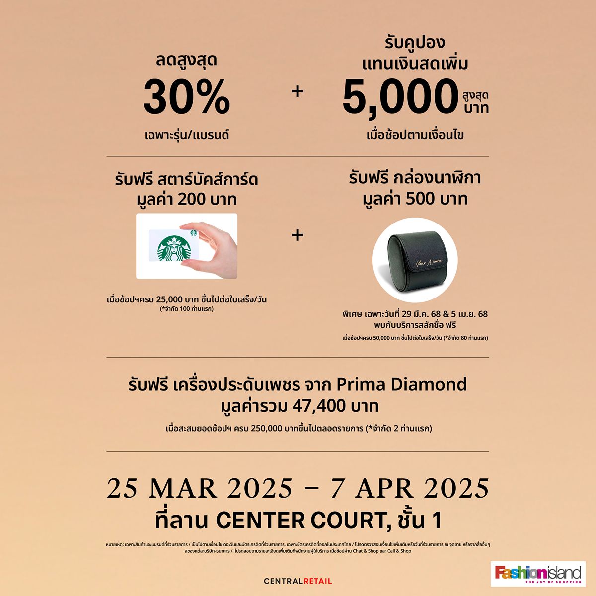 - รับฟรี สตาร์บัคส์การ์ด มูลค่า 200.- เมื่อช้อปฯครบ 25,000.- / ใบเสร็จ / วัน (จำกัด 100 ท่านแรก)
