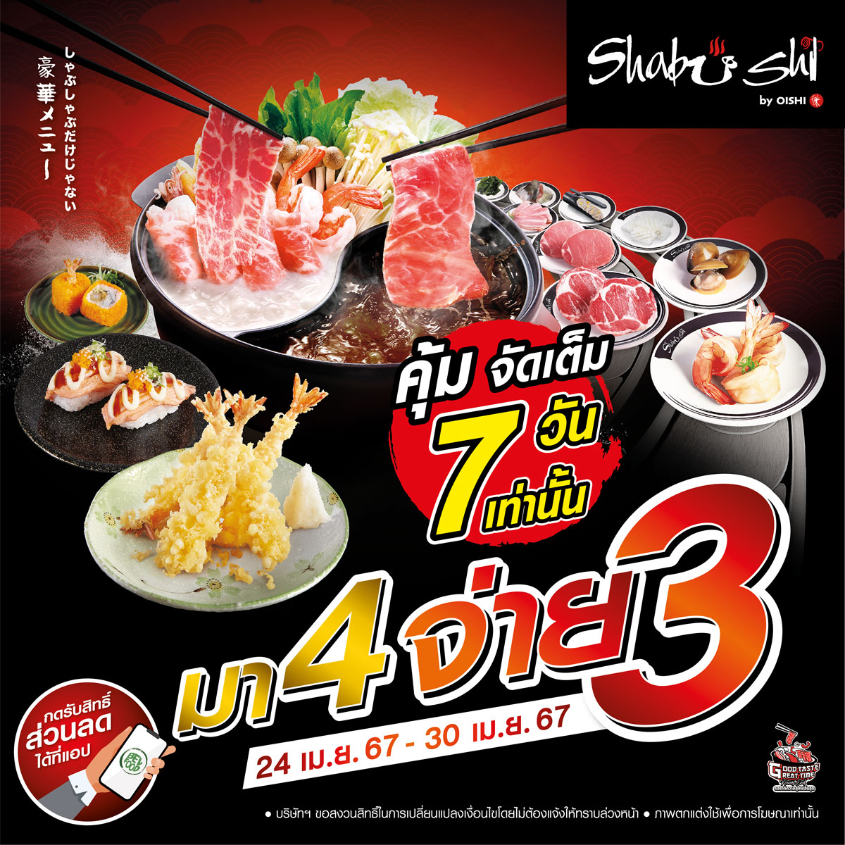 รายละเอียดโปรโมชั่นเพิ่มเติม | คลิก https://oishifood.com/page/shabushi-4pay3-apr24