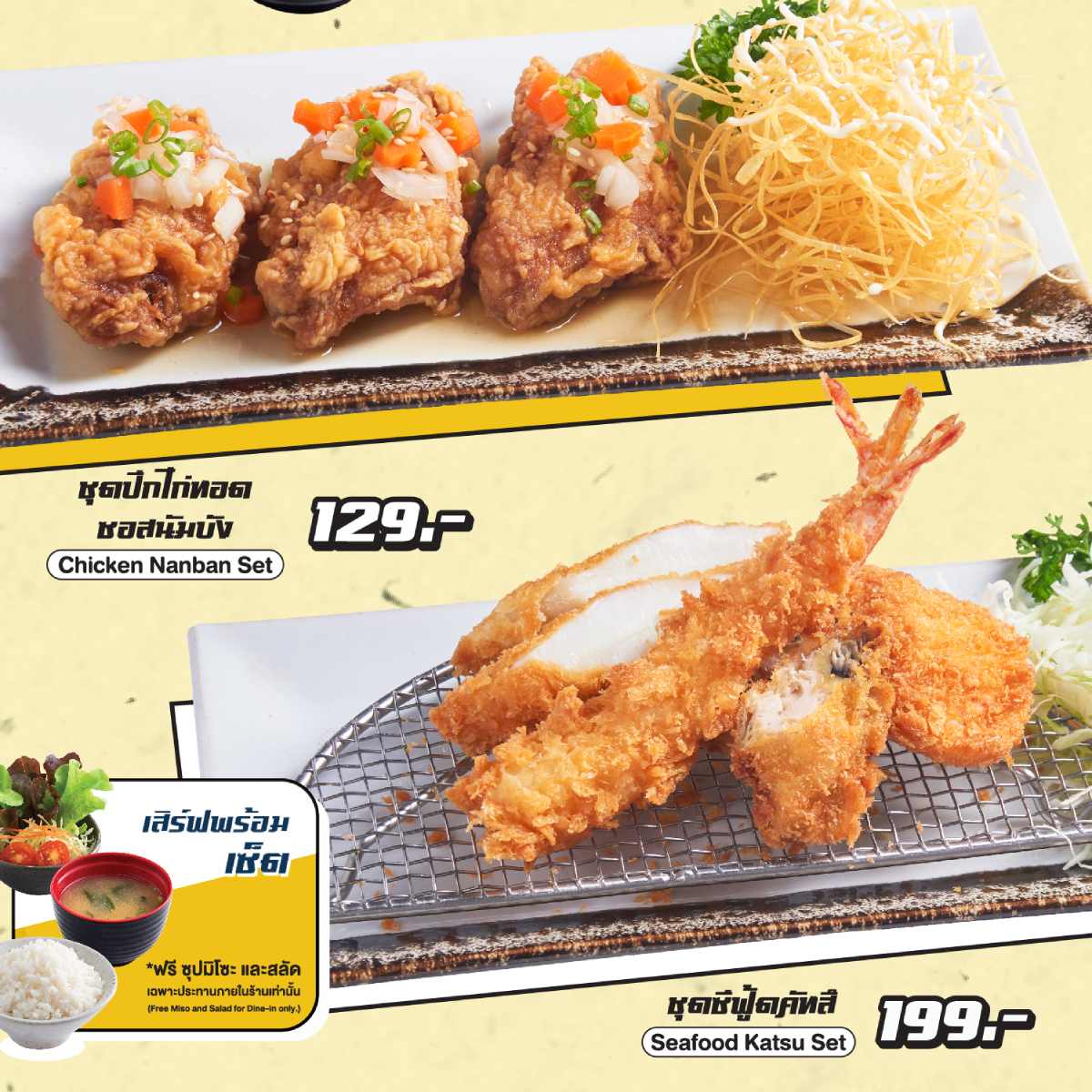 เปิดตัวเมนูใหม่ล่าสุด! จัดเต็มทั้ง 5 เมนู ให้ทุกคนมาสัมผัสความอร่อยในสไตล์ญี่ปุ่น และพิเศษอีกขั้น ทุกเซ็ตฟรีซุปมิโซะและสลัด เมื่อทานที่ร้านด้วยนะ!