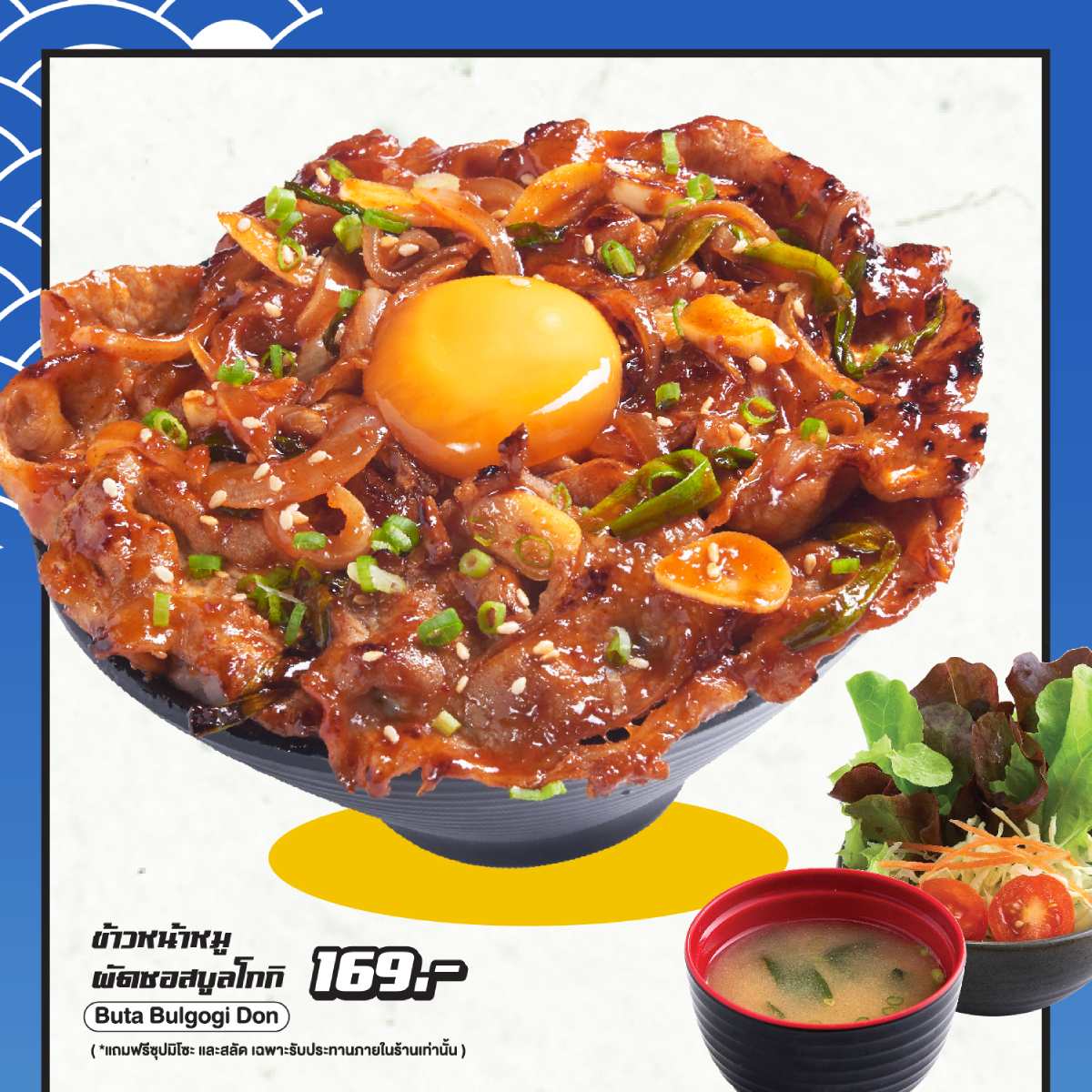 ข้าวหน้ากุ้งโบตั๋นดองตัวโตๆ ท้อปด้านบนด้วยไข่แดงดิบ เสิร์ฟพร้อมน้ำยำรสแซ่บ - ข้าวหน้าหมูผัดซอสบูลโกกิ (Buta Bulgogi Don) ราคา 169.-