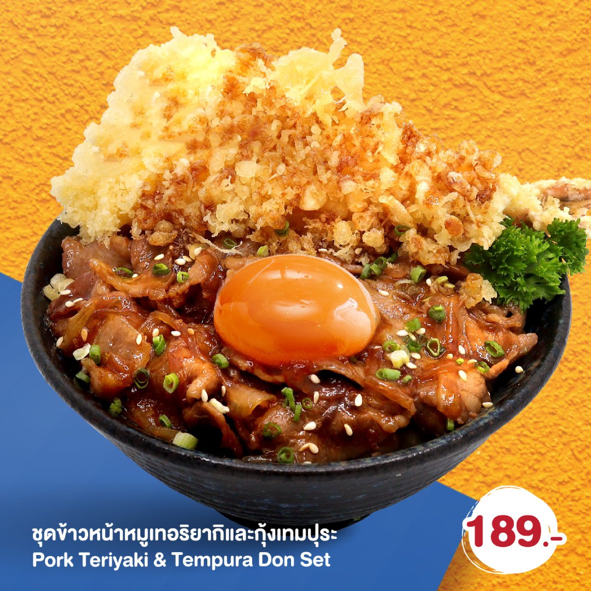 - ชุดข้าวหน้าหมูเทอริยากิและกุ้งเทมปุระ 189.-