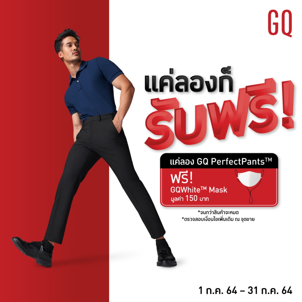 GQ ท้าลอง!! Try On PerfectPants™ เพียงคุณแวะมาลอง กางเกง GQ PerfectPants™ ที่สุดแห่งกางเกง หรือซื้อ รับฟรี GQ White™ Mask มูลค่า 150 บาท พร้อมกับ โปรโมชั่น พิเศษ!! กับ การท้าลองอีกมากมาย