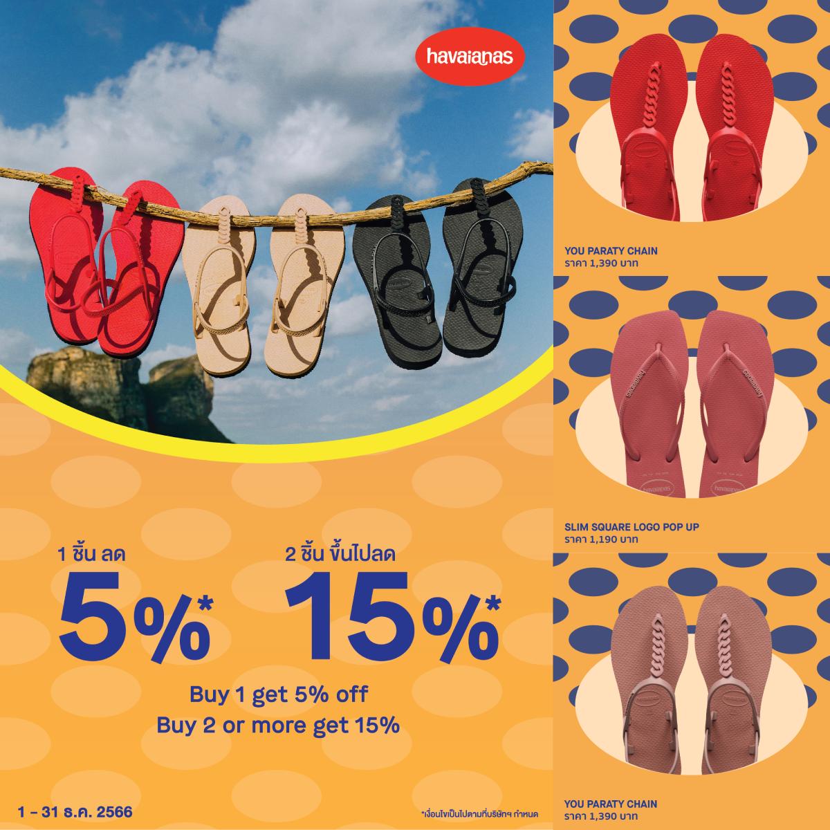 06 Dec 2566เตรียมพุ่งตัวไปบุกช้อป Havaianas โปรแรง แบบฉุดไม่อยู่ !! สินค้าราคาปกติ ซื้อ 1 ชิ้น ลด 5% ซื้อ 2 ชิ้นขึ้นไป ลด 15%