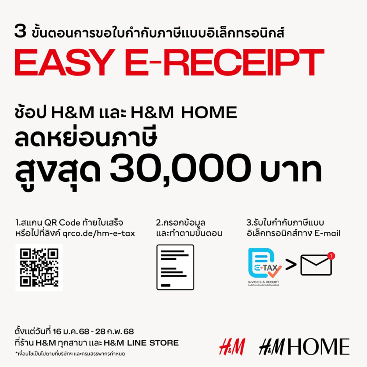 คลิกที่นี่: qrco.de/hm-e-tax - ขั้นตอนการขอใบกำกับภาษีแบบอิเล็กทรอนิกส์ (e-Tax Invoice) สำหรับร้าน H&M และ H&M HOME ทุกสาขา