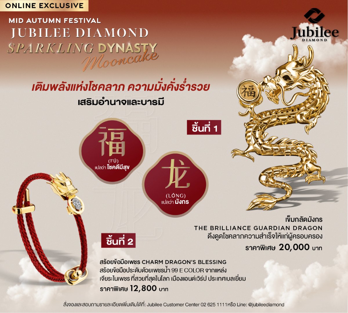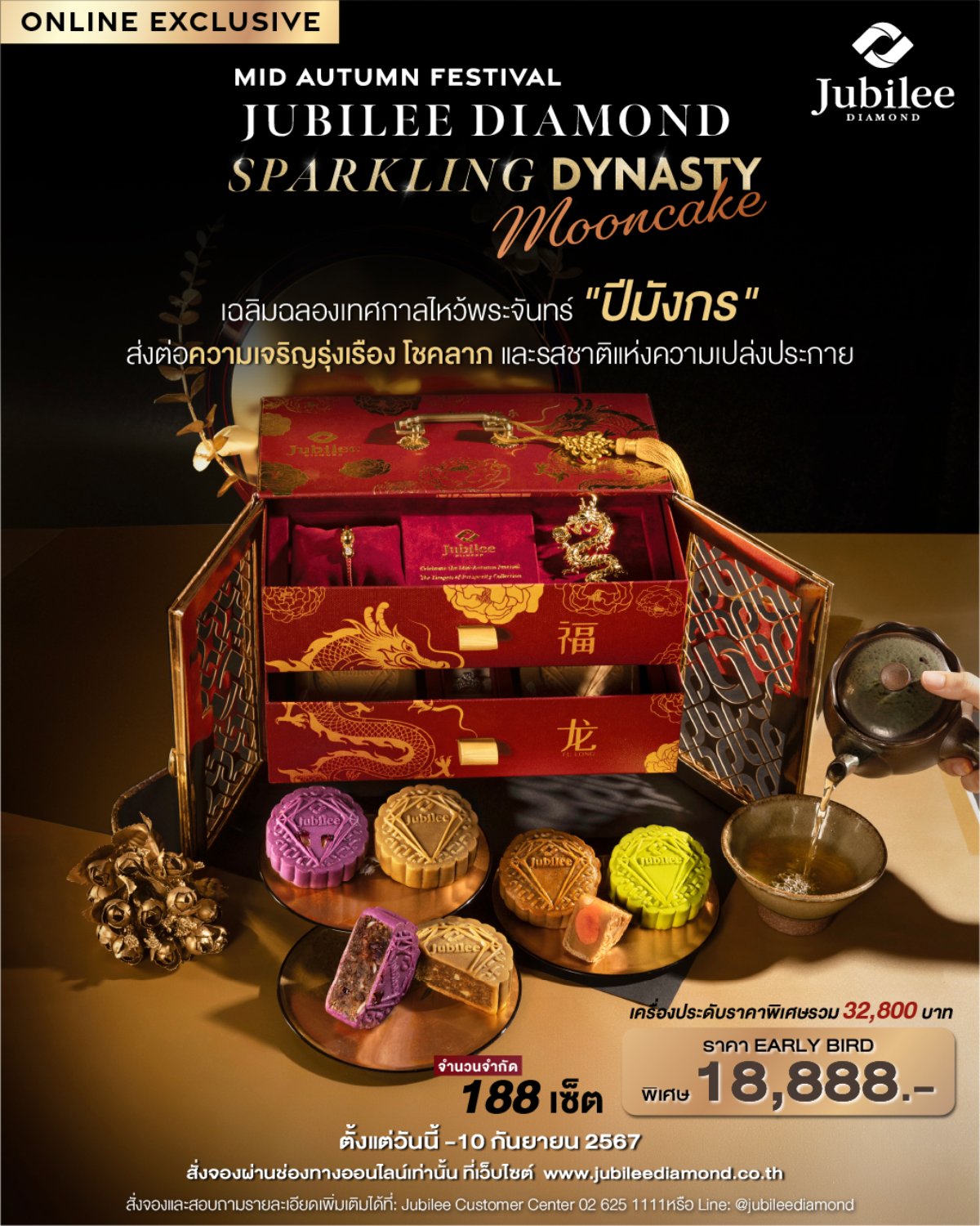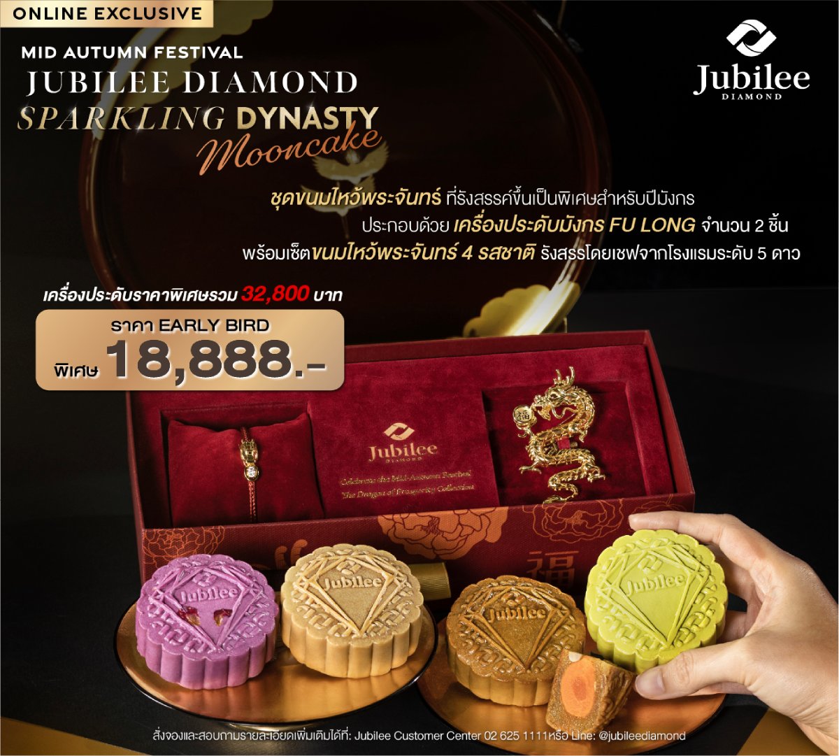10 Sep 2567ครั้งแรกกับขนมไหว้พระจันทร์ เซ็ตมังกรสุดมงคลอลังการ จาก ยูบิลลี่ ไดมอนด์ ต้อนรับเทศกาลไหว้พระจันทร์ด้วย Jubilee Diamond Sparkling Dynasty Mooncake ชุดขนมไหว้พระจันทร์ที่รังสรรค์ขึ้นเป็นพิเศษช่วยเรียกความเฮง เสริมความเป็นสิริมงคล กับเครื่องประดับมังกร Fu Long collection สัญลักษณ์แห่งพลังและความมั่งคั่ง มาพร้อมกับเซ็ตขนมไหว้พระจันทร์ 𝟒 รสชาติสุดพิเศษ ร่วมมอบประสบการณ์สุดพิเศษเป็นของขวัญอันล้ำค่าเแด่ผู้ใหญ่ที่คุณเคารพรัก หรือเสริมความเป็นสิริมงคลและนำพาความโชคดีมาสู่ตัวท่านและครอบครัว กับ ชุดขนมไหว้พระจันทร์ Jubilee Diamond Sparkling Dynasty Mooncake