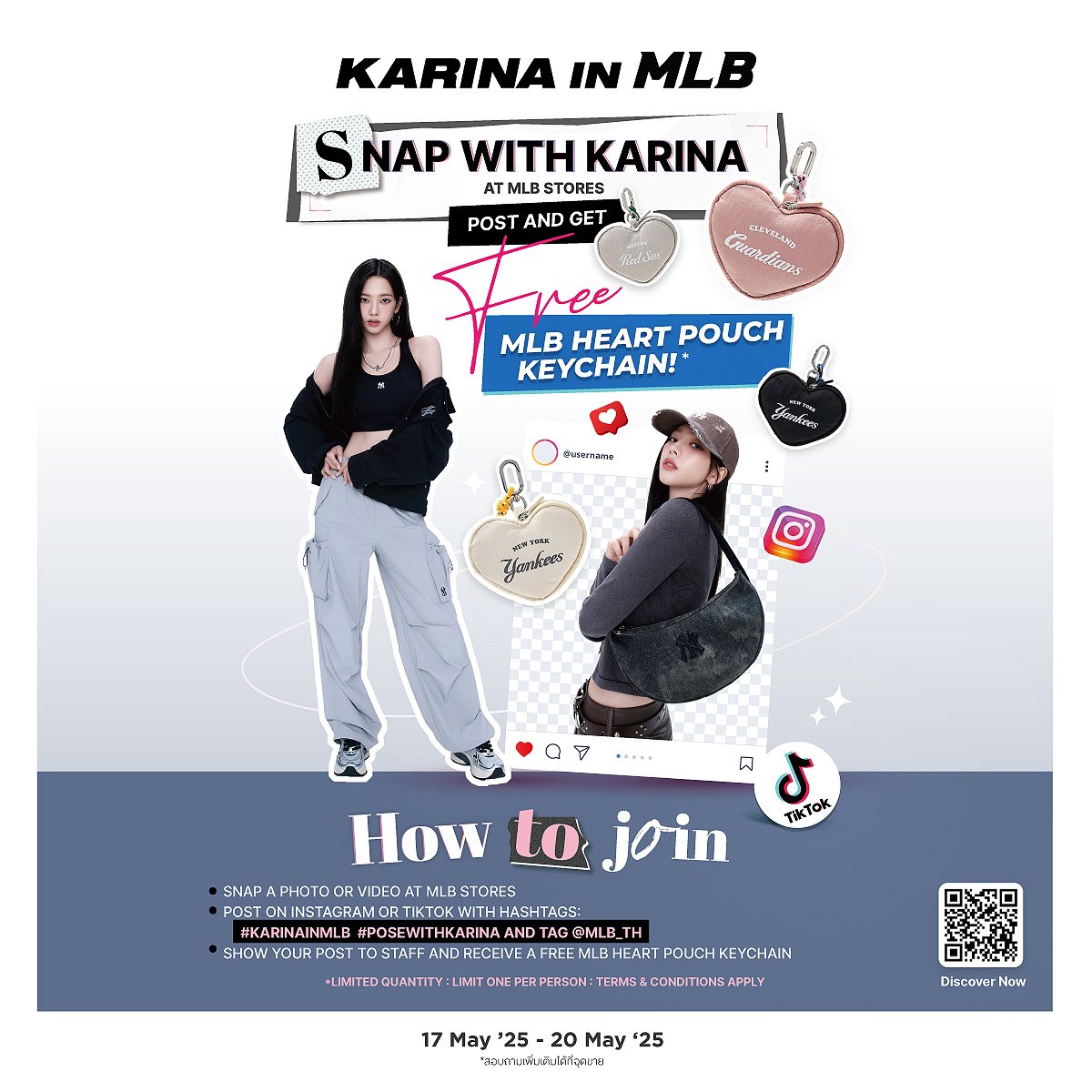 Snap with KARINA & Get MLB Heart Pouch Keychain เพียงถ่ายรูปหรือวิดีโอกับป้ายหรือสแตนดี้ KARINA