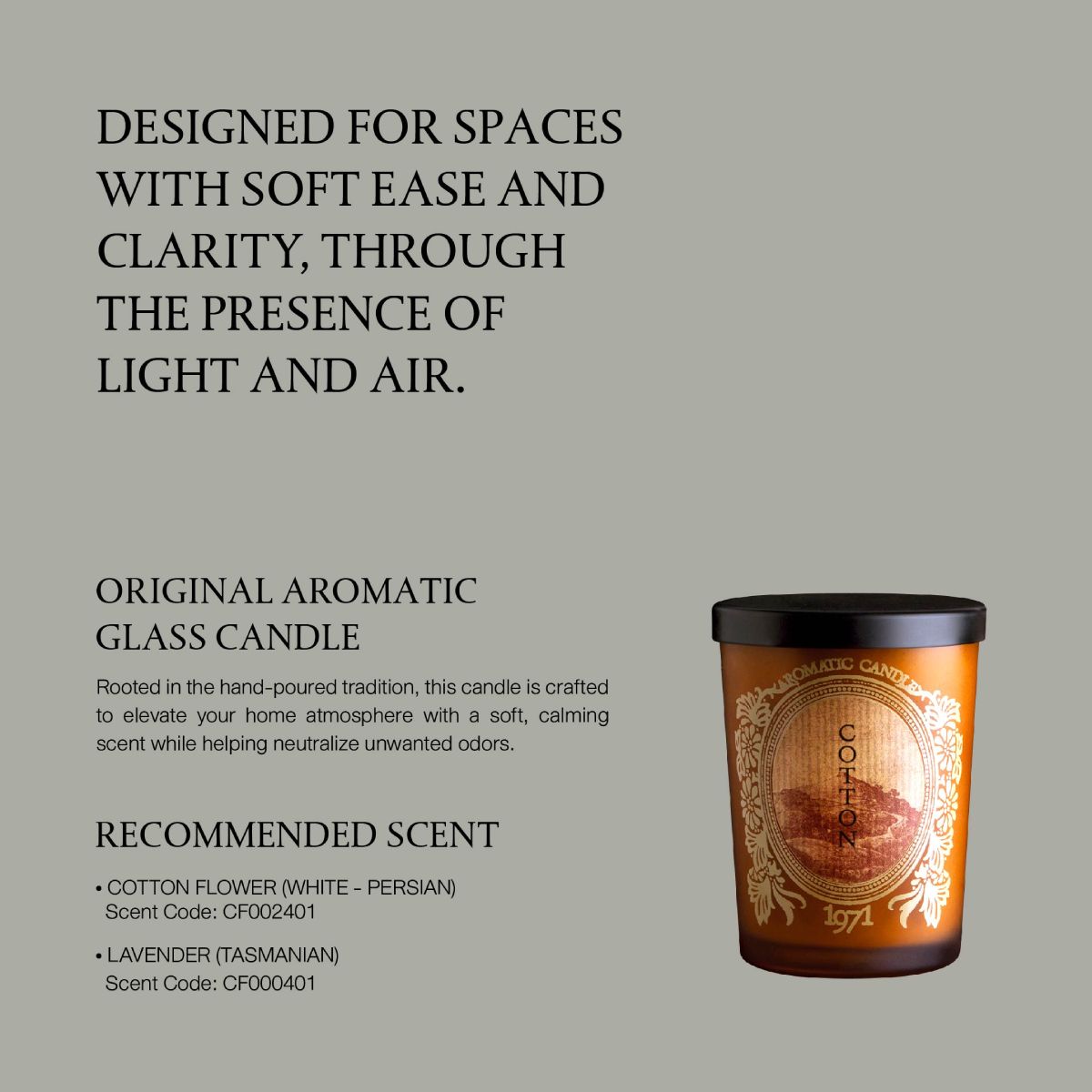– Scent Code: CF000401ลาเวนเดอร์จากรัฐแทสมาเนียให้โทนกลิ่นสดชื่น โปร่ง และสะอาด ผสานโทนกลิ่นของสมุนไพรอย่างลงตัว ช่วยทำให้อากาศโดยรอบนิ่งลงและเบาสบายมากขึ้น เหมาะกับช่วงเวลาที่ต้องการความสงบและการปลอบประโลม