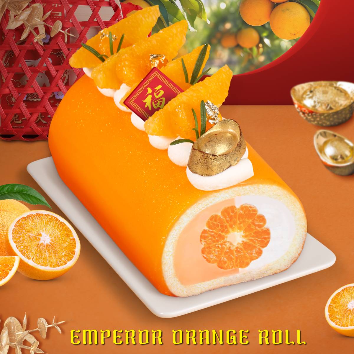 โรลส้มมหามงคล…ยกส้มตรุษจีนปีนี้ ด้วยโรลส้ม 3 สายพันธุ์ สอดไส้ดับเบิ้ลครีมสด รสส้ม ‘มิกัน’ จากญี่ปุ่น อัดแน่นส้ม ‘ซาถัง’ จักรพรรดิจากไต้หวันกว่า 5 ลูก ท็อปปิ้งส้มสดและช็อกโกแลตทองคำทานได้ ส่งมอบในตะกร้าจักสานสีแดงมงคล - Emperor Orange Roll Set