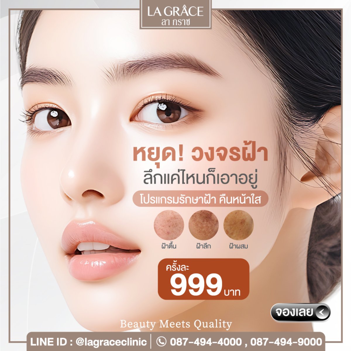หยุด วงจรฝ้า ลึกแค่ไหนก็เอาอยู่ ด้วยโปรแกรมรักษาฝ้า คืนหน้าใสที่ลา กราซ ประเมิน และรักษาโดยแพทย์อย่างใกล้ชิด จัดการได้หมดทั้งฝ้าตื้น ฝ้าลึก ฝ้าผสม พร้อมคืนหน้าไบรท์ เพิ่มความมั่นใจ 100% สาดโปรโมชั่นแรงส่งท้ายเดือน พิเศษครั้งละ 999 บาท (ซื้อได้ไม่จำกัดจำนวนครั้ง) รีบจองด่วนก่อนหมดโปร