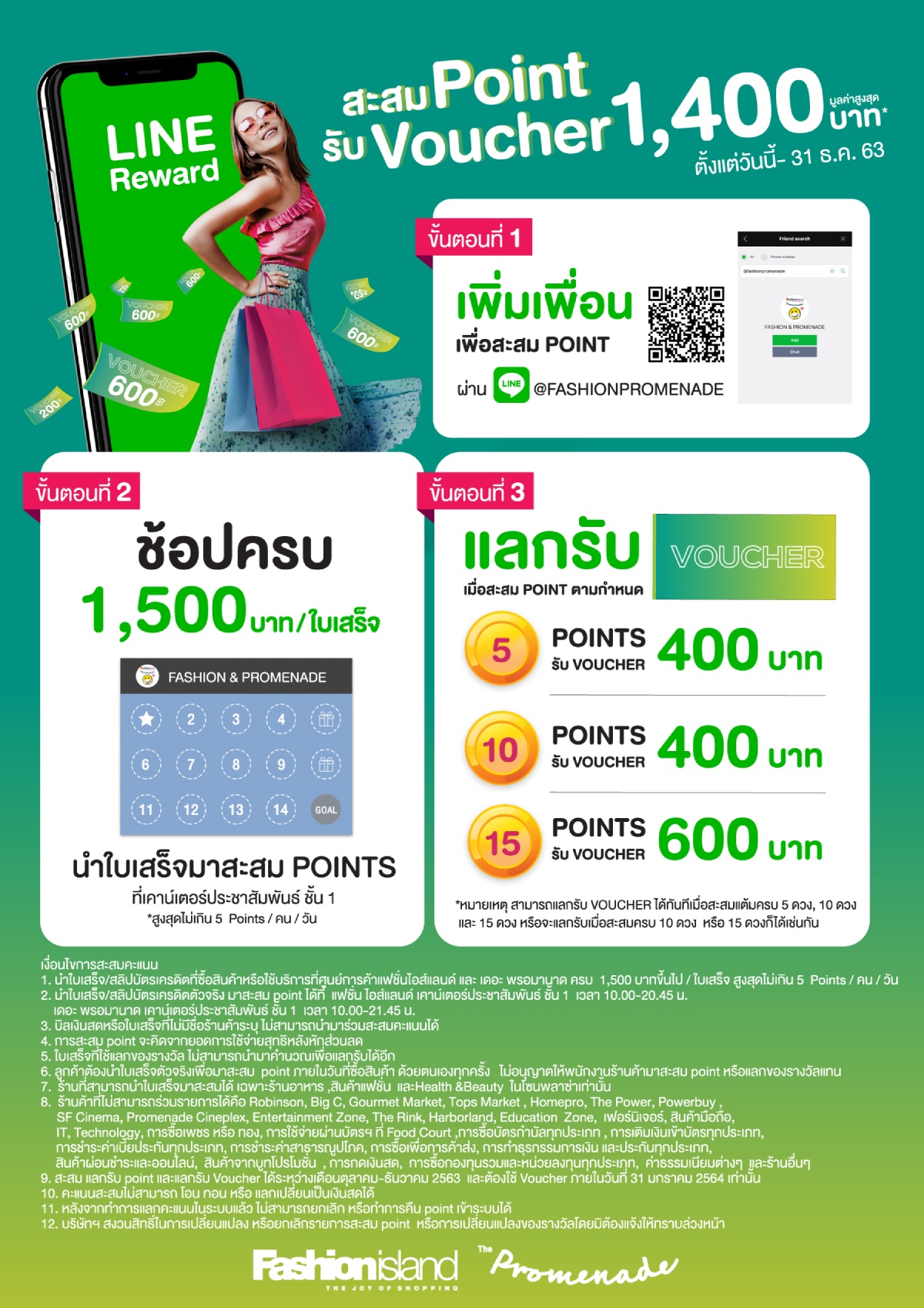- นำใบเสร็จ/สลิปบัตรเครดิตที่ซื้อสินค้าหรือใช้บริการที่ศูนย์การค้าแฟชั่นไอส์แลนด์ และเดอะ พรอมานาด ครบ 1,500 บาทขึ้นไป/ใบเสร็จ สูงสุดไม่เกิน 5 Point/คน/วัน