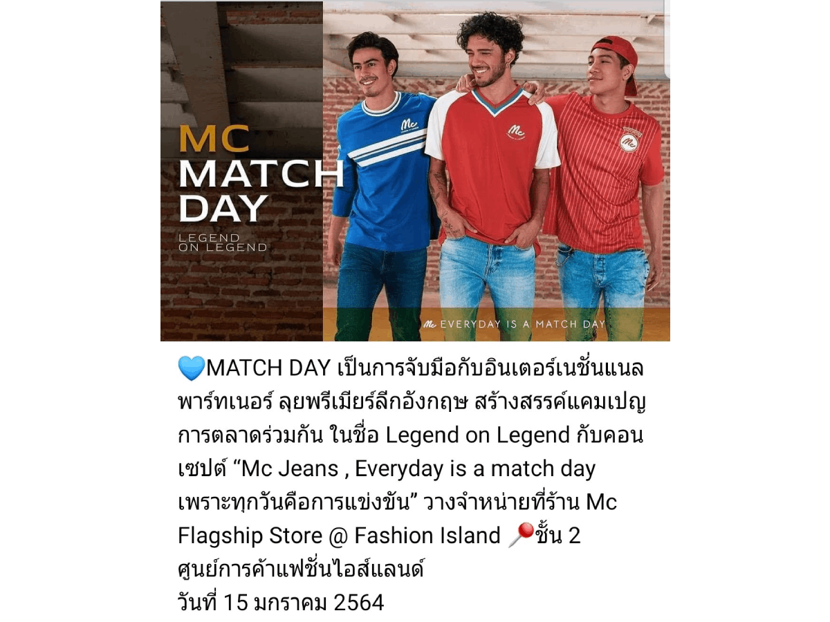 - MATCH DAY เป็นการจับมือกับอินเตอร์เนชั่นแนลพาร์ทเนอร์ ลุยพรีเมียร์ลีกอังกฤษ สร้างสรรค์แคมเปญการตลาดร่วมกัน ในชื่อ Legend on Legend กับคอนเซปต์ “Mc Jeans , Everyday is a match day เพราะทุกวันคือการแข่งขัน”