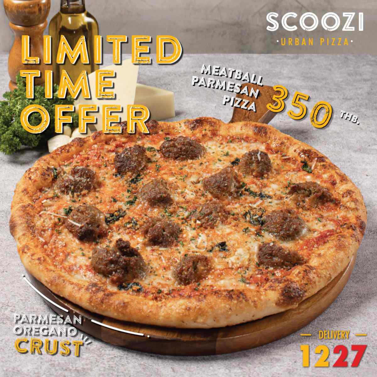 LIMITED TIME OFFER!! “Meatball Parmesan Pizza” Crunchy with Parmesan Oregano Crust topped with the homemade meatballs served to you only at Scoozi Urban Pizza & Scoozi Ready To Go at Metro Mall MRT Chatuchak