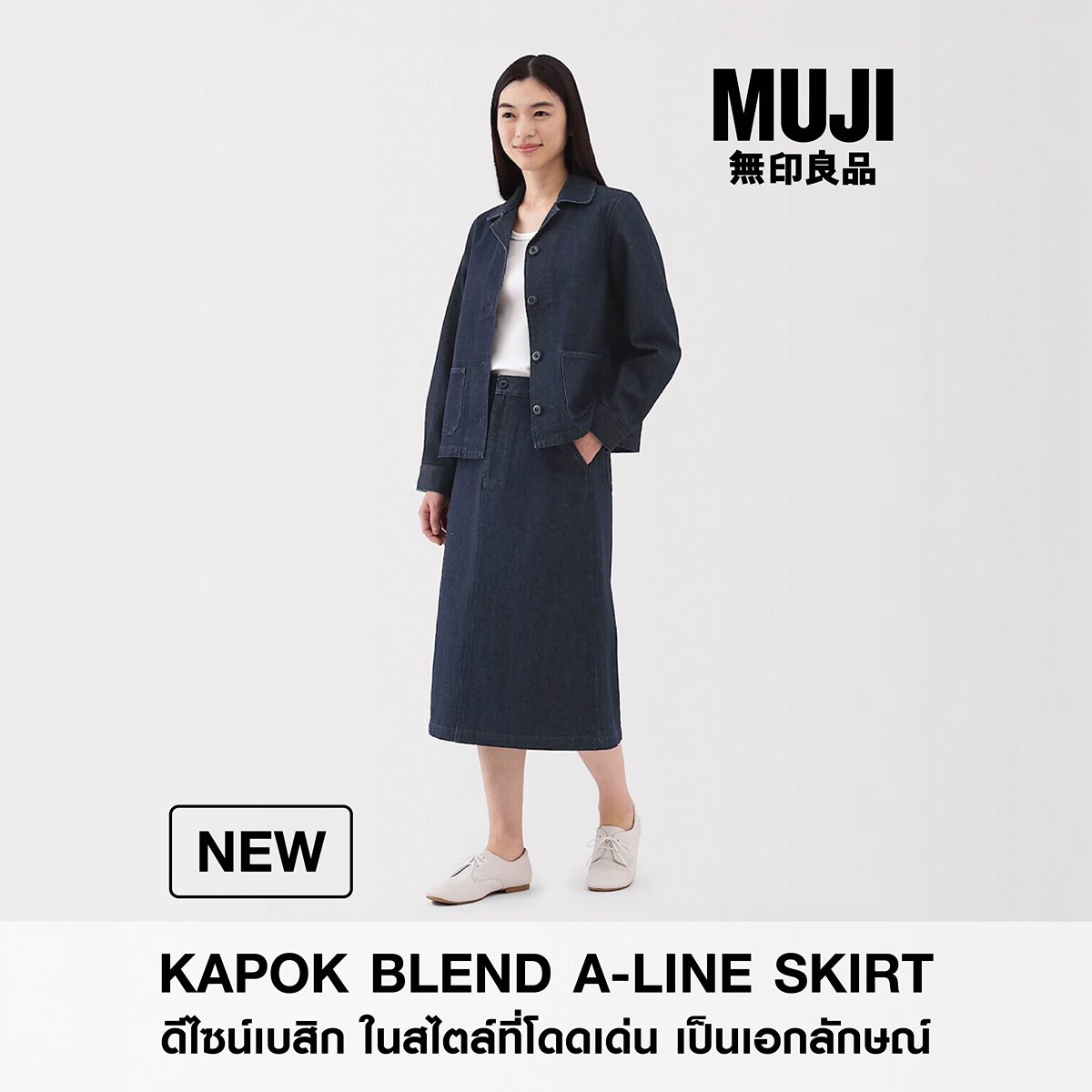 NEW : กระโปรงจากซีรีส์ KAPOK DENIM ผลิตจากผ้าเดนิมผสมใยนุ่น เส้นใยธรรมชาติแท้ คุณสมบัติพิเศษของเนื้อผ้าที่นุ่ม เบา ใส่สบายทั้งวัน แถมยังเป็นมิตรต่อสิ่งแวดล้อม จำหน่ายแล้ววันนี้ที่ร้านมูจิทุกสาขา*