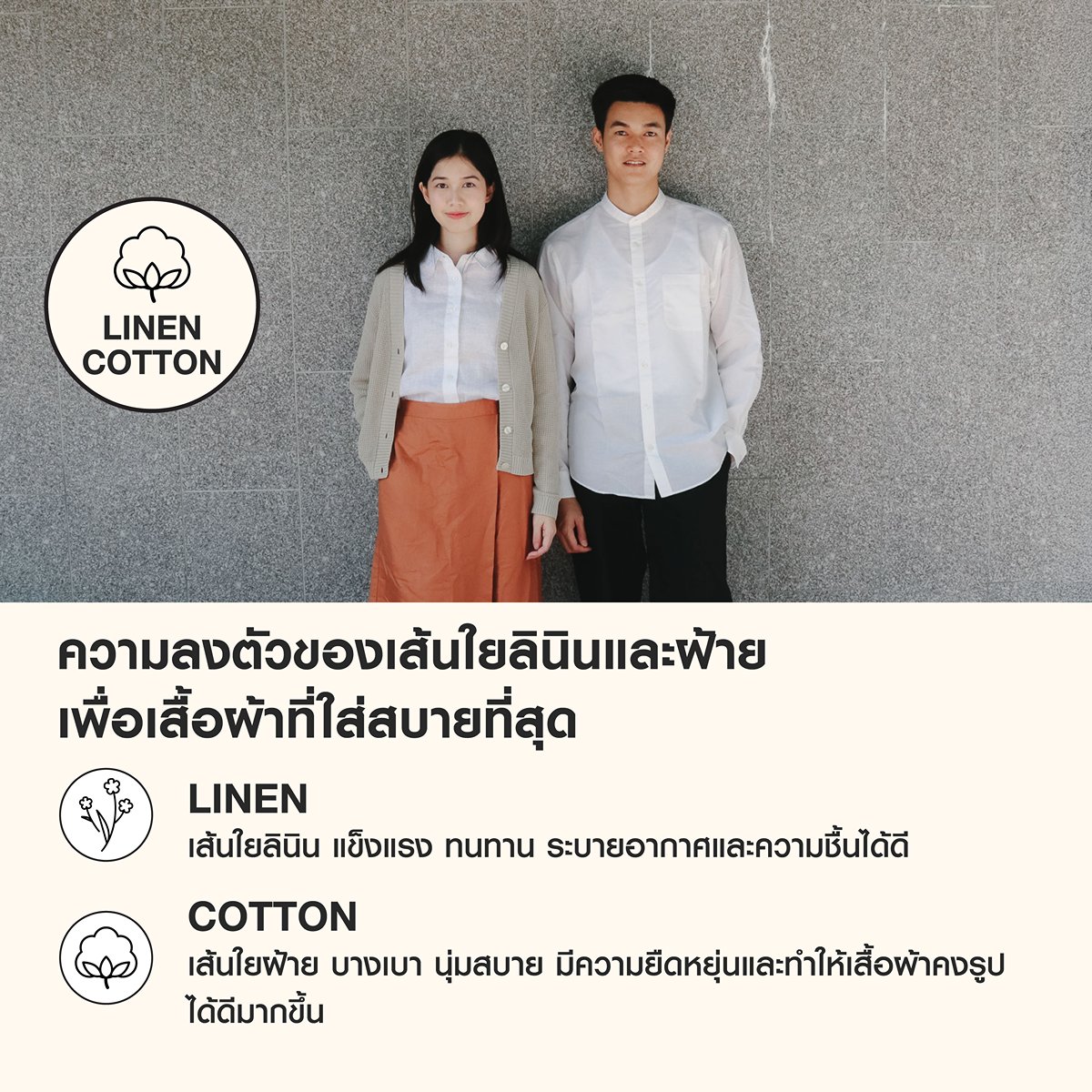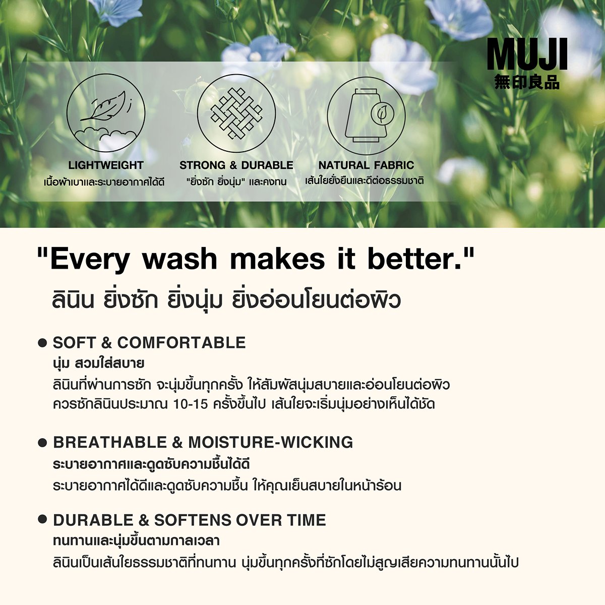 Linen Series ลินิน สัมผัสความนุ่มนวลทุกครั้งที่สวมใส่ พร้อมดีไซน์หลากหลายที่ตอบโจทย์ทุกไลฟ์สไตล์ได้ในทุกวัน ลินินจากมูจิมีคุณสมบัติเบาบาง โปร่งสบาย และยืดหยุ่นเมื่อสัมผัสกับผิว ผ้าลินินจะนุ่มและใส่สบายขึ้นเมื่อซักหลายๆ ครั้ง จะยิ่งทำให้คุณหลงรักเมื่อสวมใส่ไปนานๆ