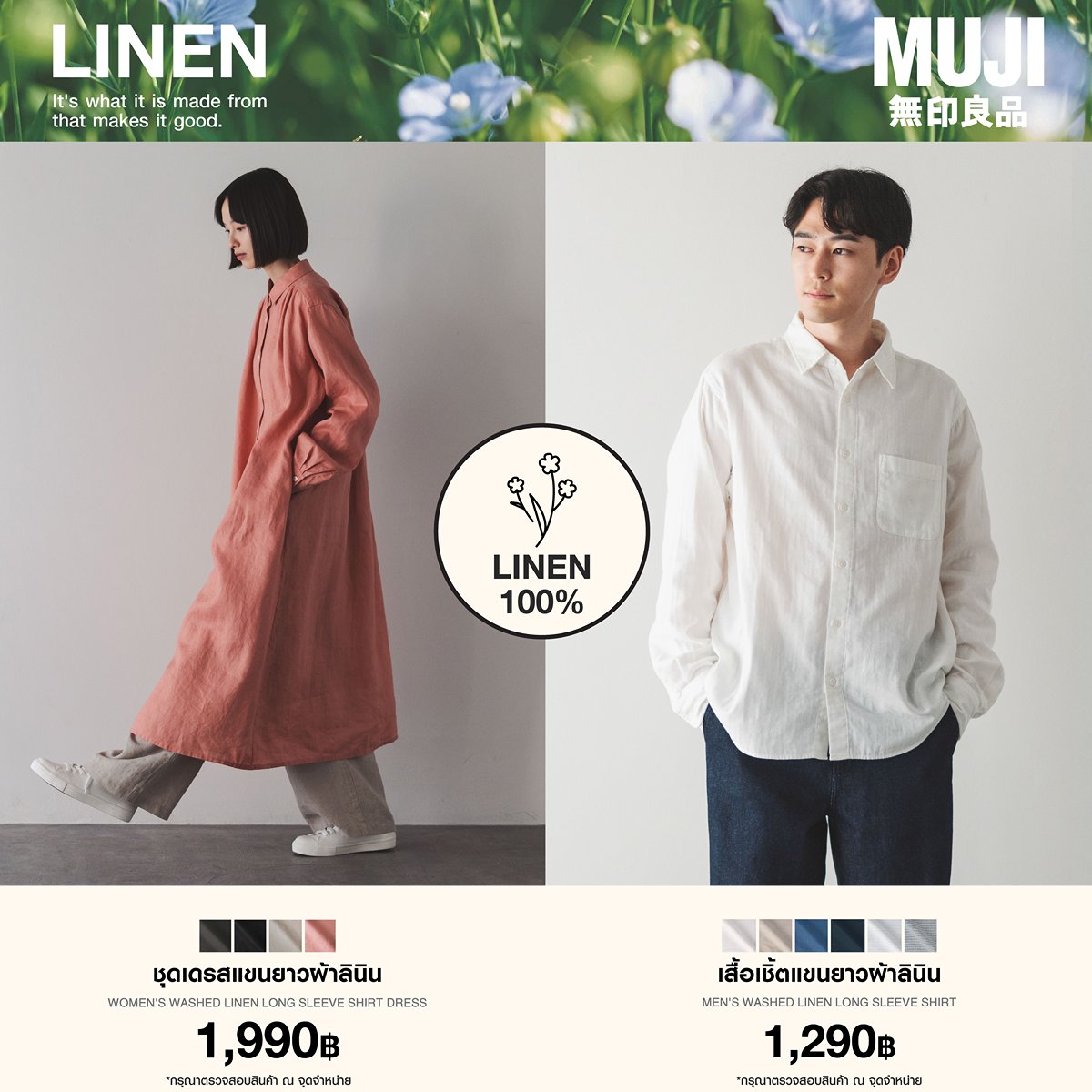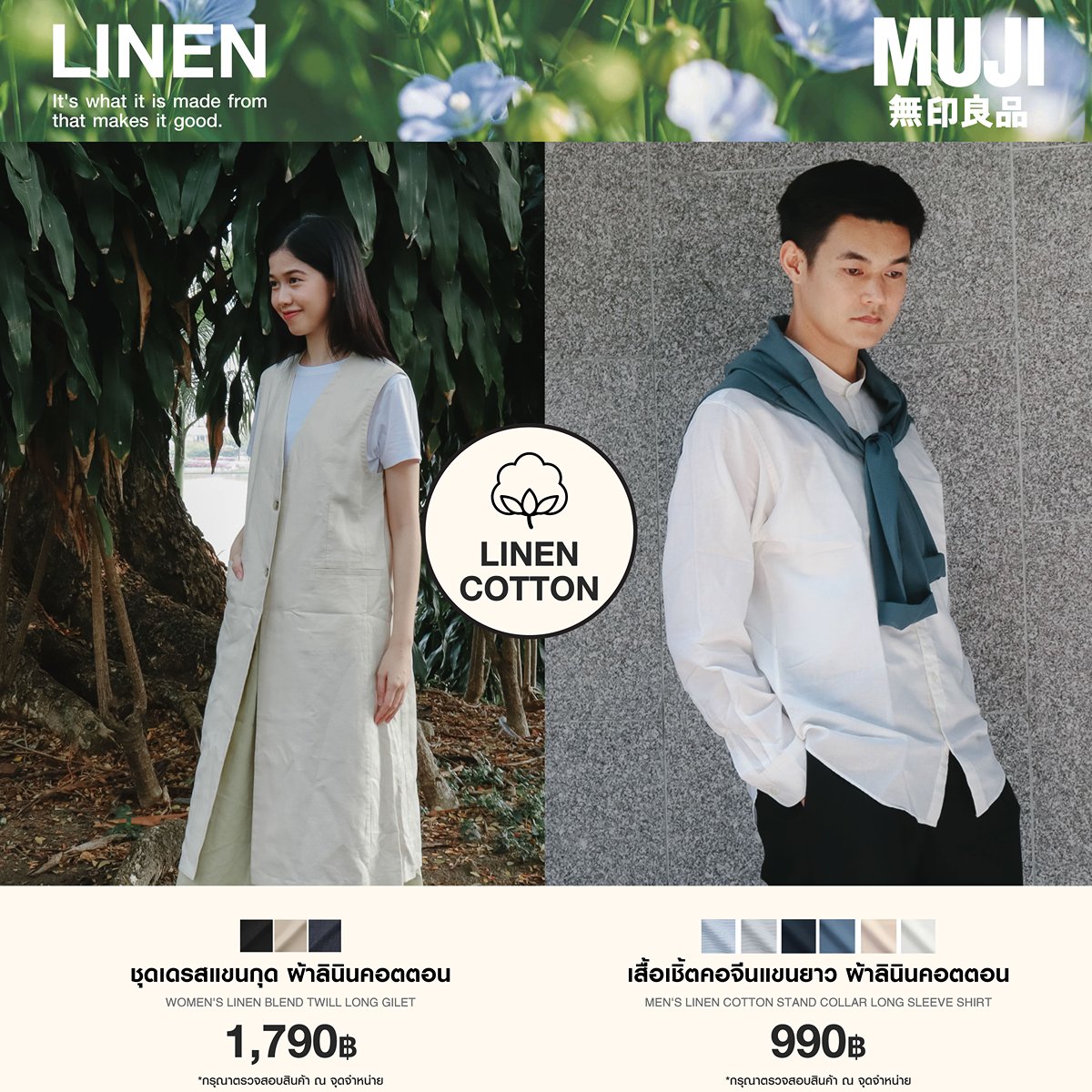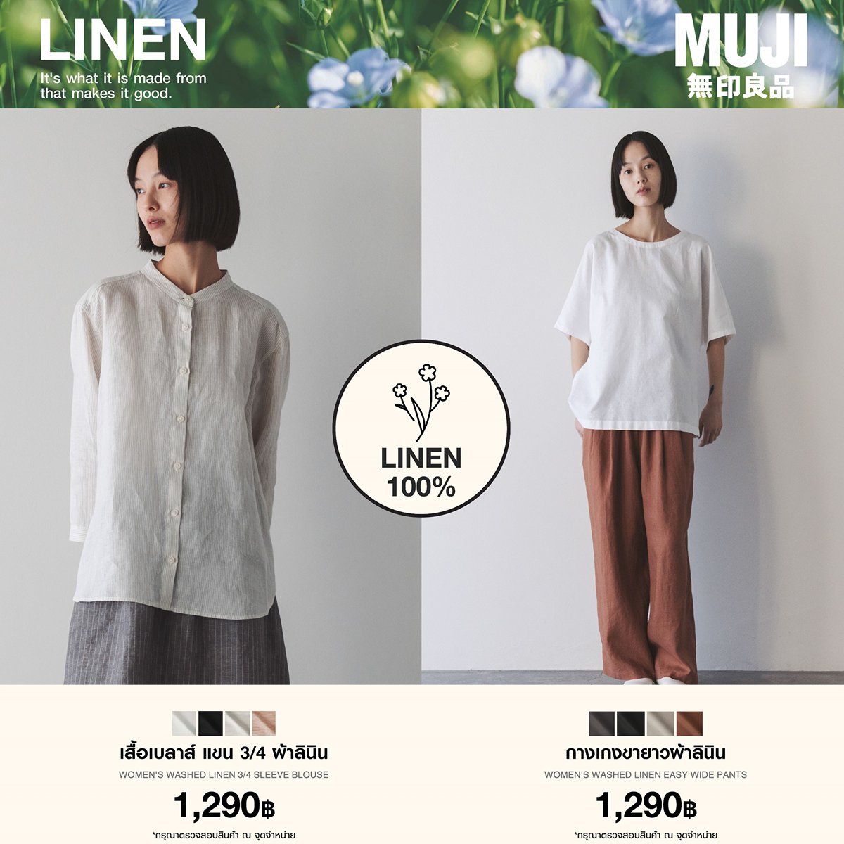 “เสื้อผ้าลินินของมูจิ เราใส่ใจในทุกกระบวนการ ดีต่อธรรมชาติ และดีต่อผู้สวมใส่” มูจิให้ความสำคัญกับความยั่งยืน เราได้เลือกใช้ลินินที่ผ่านกระบวนการที่เป็นมิตรกับธรรมชาติ และใช้ลินินคุณภาพสูงจากแหล่งปลูกในภูมิภาคฝรั่งเศส ซึ่งเป็นภูมิภาคที่เหมาะกับการปลูกลินินมากที่สุดในโลก โดยกระบวนการปลูกไม่ใช้สารเคมีและยาฆ่าแมลง จึงไม่ส่งผลเสียต่อสิ่งแวดล้อม และไม่เป็นอันตรายต่อผู้สวมใส่ กรุณาตรวจสอบสินค้าอีกครั้ง ณ จุดจำหน่าย⁣⁣⁣⁣⁣⁣⁣