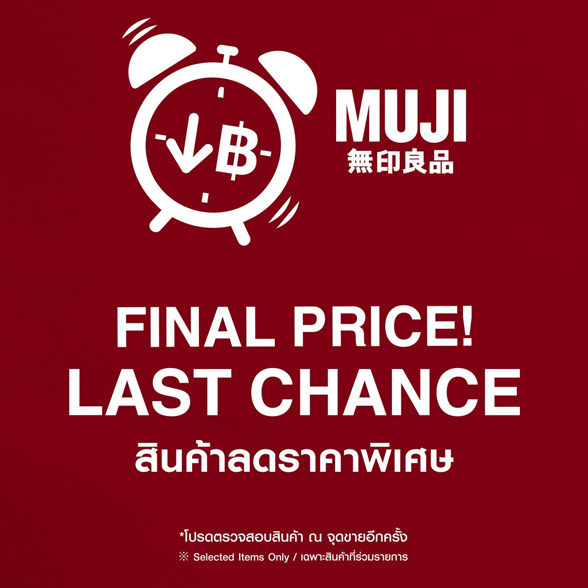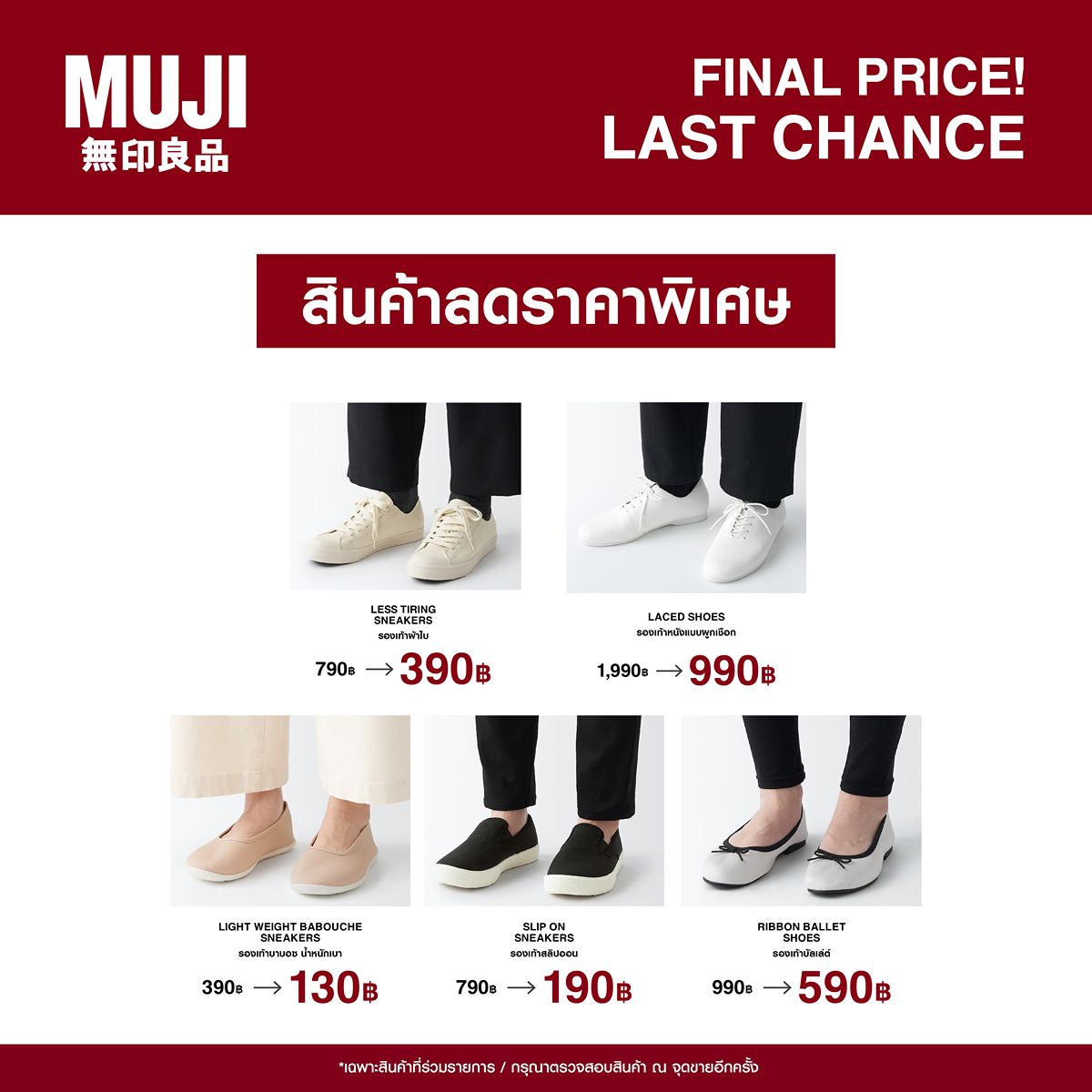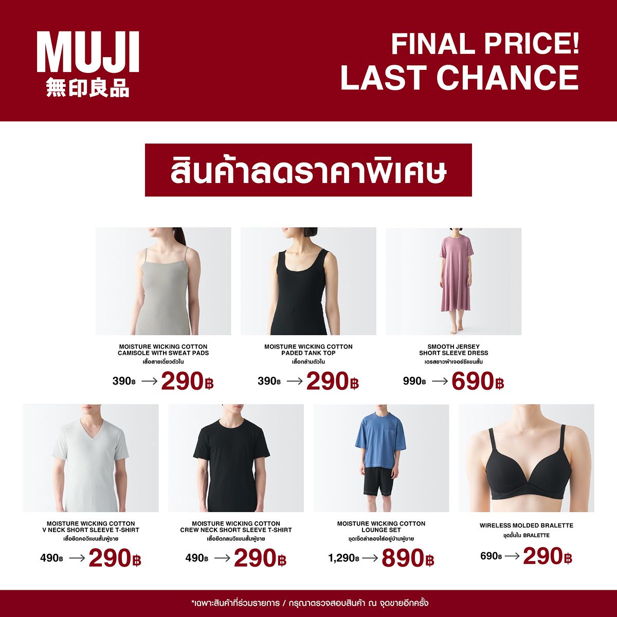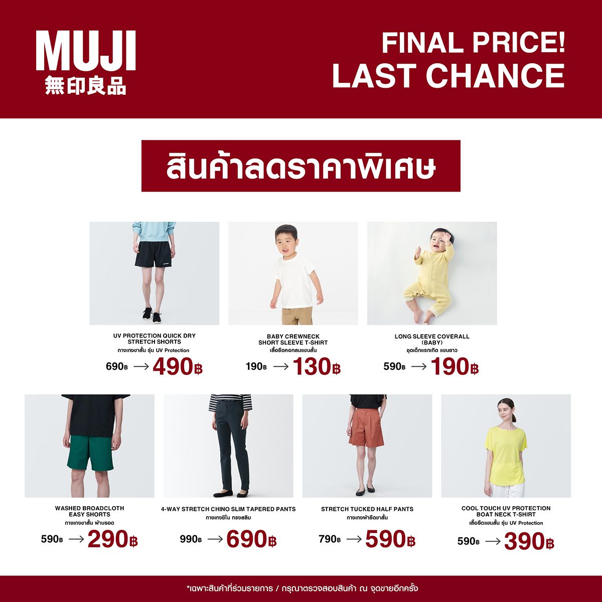 Final Price! Last Chance! โอกาสสุดท้าย! ช้อปสินค้าหมวดหมู่เครื่องแต่งกายแบบจัดเต็มได้ในราคาสบายกระเป๋า เริ่มต้นเพียง 130 บาท ไม่ว่าจะเป็นเสื้อผ้า กางเกง หรือรองเท้าก็ลดราคาพิเศษ มาช้อปกันได้เลยวันนี้ที่มูจิก่อนสินค้าจะหมด