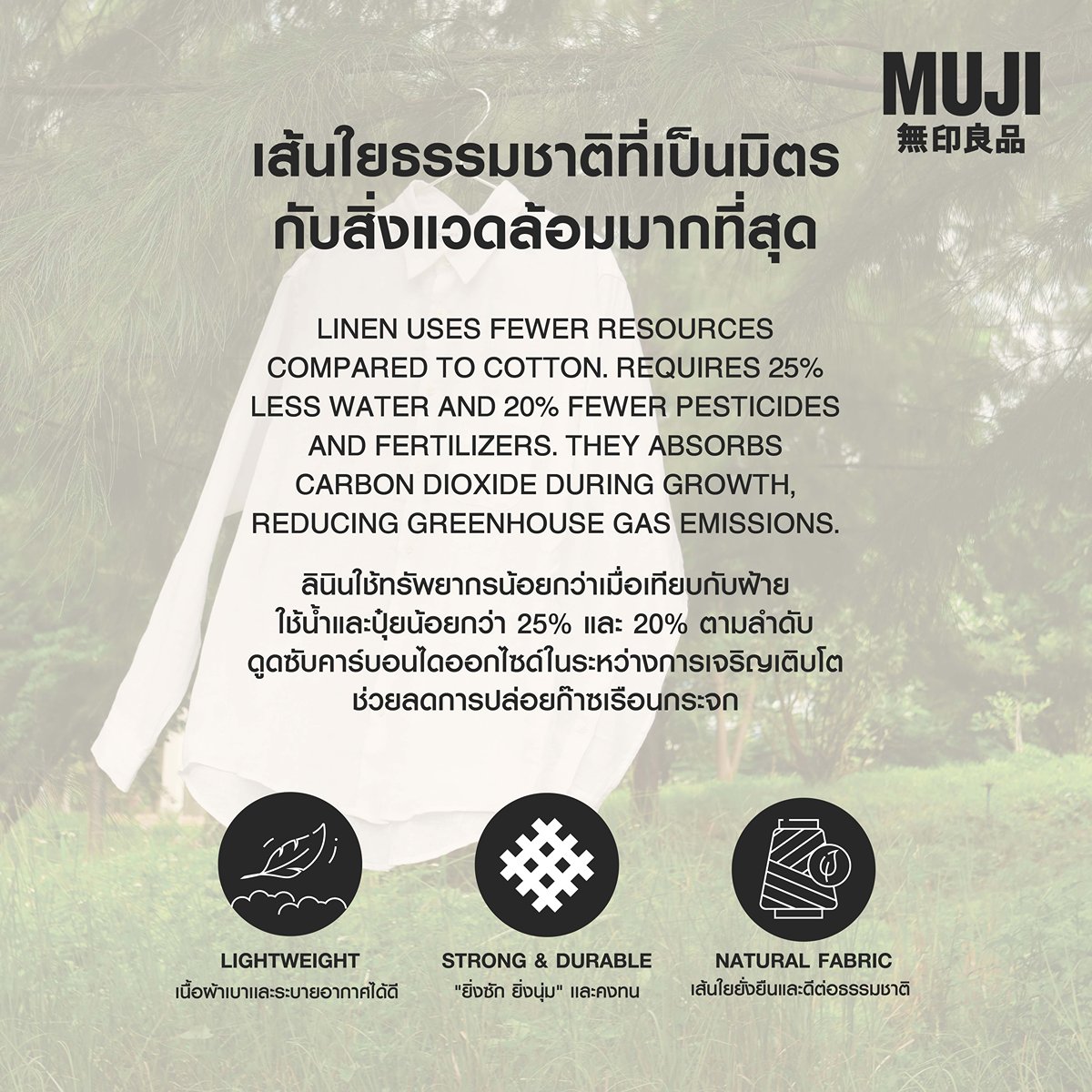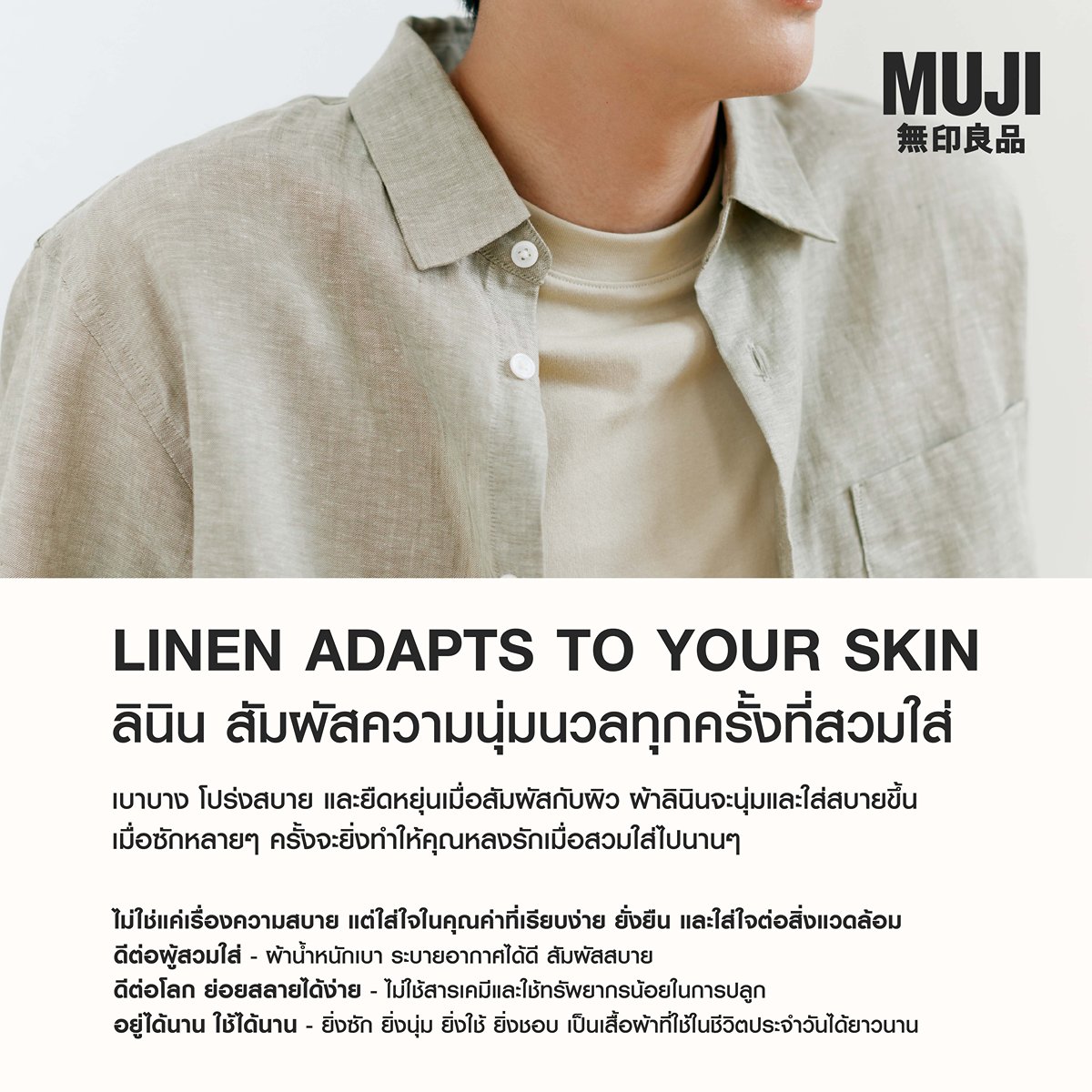 “เสื้อผ้าลินินจาก MUJI มอบความสบายจากธรรมชาติ อ่อนโยนต่อผิว และใส่ใจต่อโลก” More than comfort. A conscious way to live. เสื้อผ้าลินินมูจิไม่ได้ให้แค่ความสบาย แต่ยังสะท้อนถึงคุณค่าที่เรียบง่ายและยั่งยืน เราได้เลือกใช้ลินินที่ผ่านกระบวนการปลูกที่เป็นมิตรกับธรรมชาติ ใช้ทรัพยากรน้อยในการปลูก ไม่ใช้สารเคมีและยาฆ่าแมลง จึงไม่ส่งผลเสียต่อสิ่งแวดล้อม และไม่เป็นอันตรายต่อผู้สวมใส่ รวมไปถึงใช้ลินินคุณภาพสูงจากแหล่งปลูกในภูมิภาคฝรั่งเศส ซึ่งเป็นภูมิภาคที่เหมาะกับการปลูกลินินมากที่สุดในโลก เสื้อผ้าลินินจากมูจิจึงมีคุณสมบัติเบาบาง โปร่งสบาย และยืดหยุ่นเมื่อสัมผัสกับผิว ผ้าลินินจะนุ่มและใส่สบายขึ้นเมื่อซักหลายๆ ครั้ง และจะยิ่งทำให้คุณหลงรักเมื่อสวมใส่ไปนานๆ