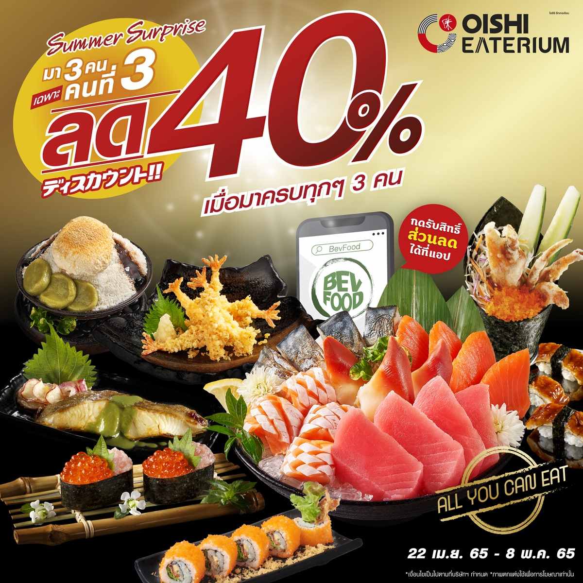 โออิชิ อีทเทอเรียม ชวนคุณอิ่มฟิน เพียงฟอร์มทีมให้ครบ 3 คน รับส่วนลด 40% เฉพาะคนที่ 3 ทันที รับสิทธิ์ง่ายๆ ผ่านแอป BevFood