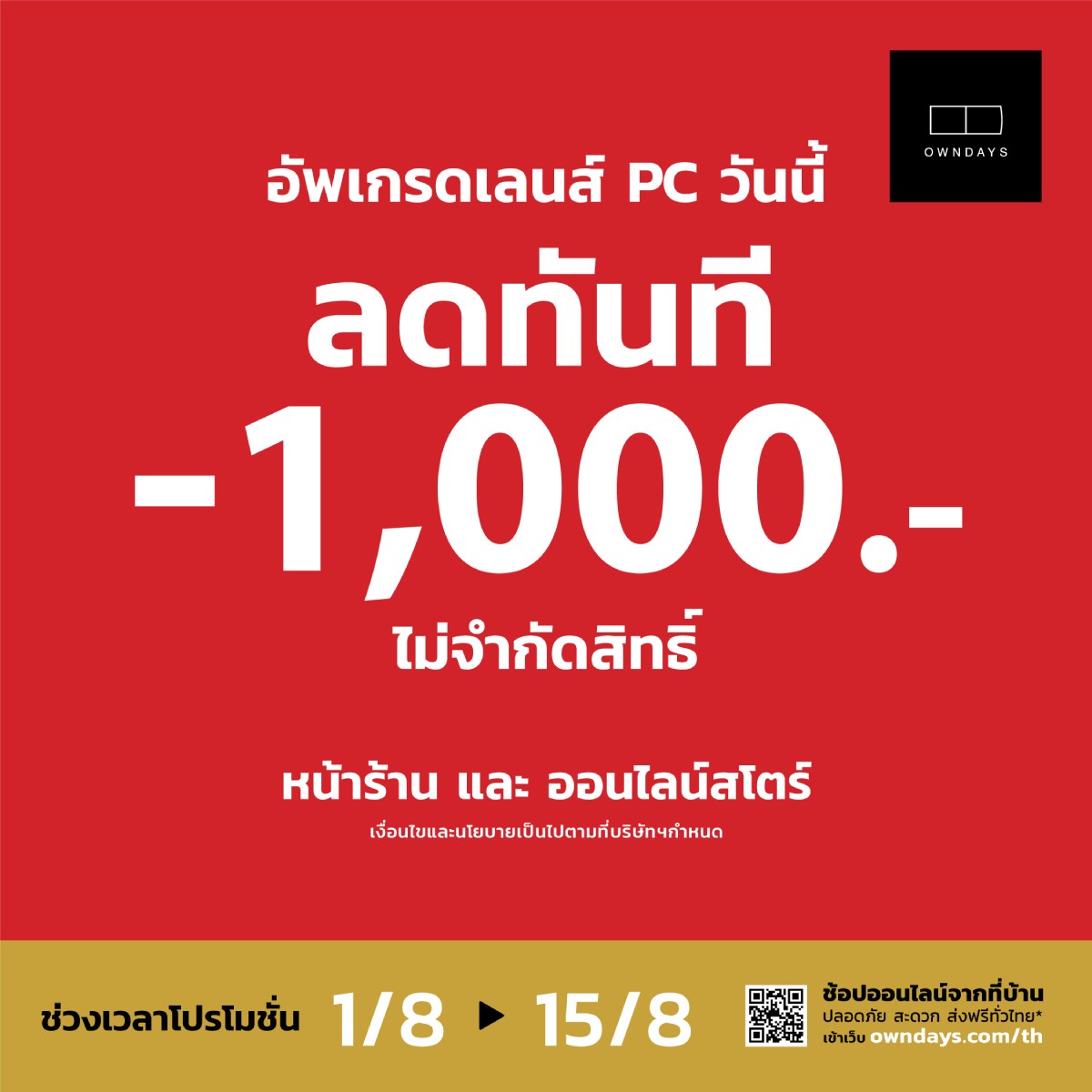 OWNDAYS PC Lens SALE ส่วนลดพิเศษ 1,000 บาท สำหรับลูกค้าที่ซื้อเลนส์กรองแสงสีฟ้า PC Lens