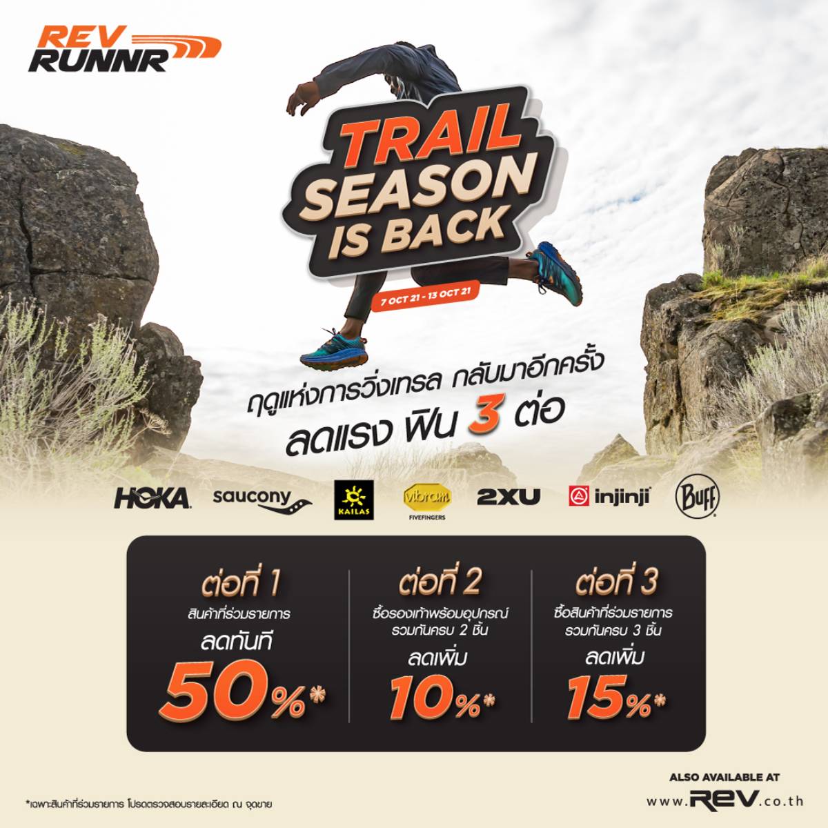 พบสินค้าจากแบรนด์ HOKA, SAUCONY, KAILAS, VIBRAM, 2XU, INJINJI และ BUFF มาลดแรงๆให้ชาวเทรลลุยไปกับเส้นทางที่ท้าทายได้อย่างมั่นใจ