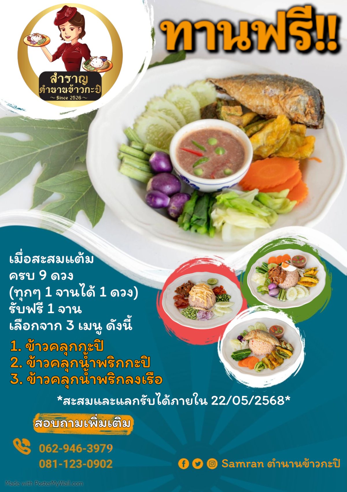 - แลกรับเมนูทานฟรี เลือกได้จากข้าวคลุกกะปิ ข้าวคลุกน้ำพริกกะปิ หรือข้าวผัดน้ำพริกลงเรือ เมนูใดเมนูหนึ่ง