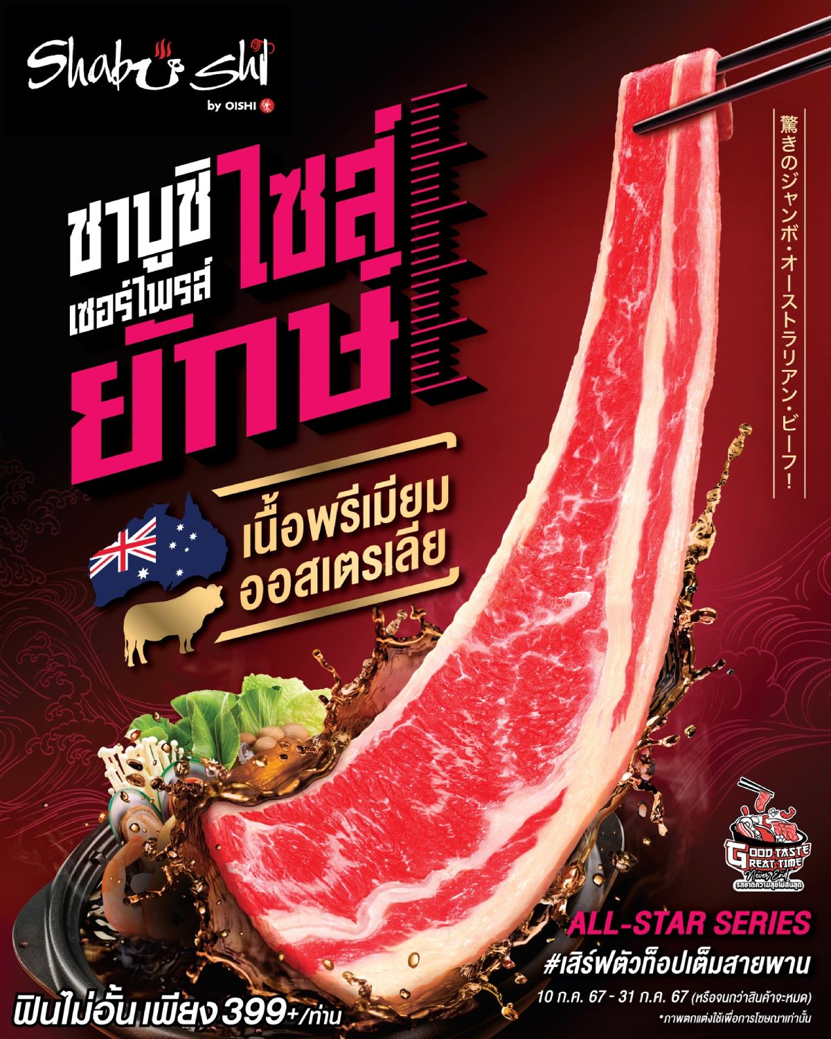 สัมผัสประสบการณ์เซอร์ไพรส์ยิ่งใหญ่ Shabushi จัดให้! ฟินไม่อั้นกับ #เนื้อออสเตรเลียพรีเมียม #เมนูตัวท็อป หนึ่งใน ALL-STAR SERIES — #สายเนื้อพลาดไม่ได้ กับเนื้อนำเข้า #ไซส์ใหญ่ #สไลซ์ยาว พร้อมหลากหลายเมนูชาบู และซูชิล้นสายพาน ที่สำคัญ! #เสิร์ฟทุกคอร์สบุฟเฟต์ จ่ายเริ่มต้นเพียง 399+ บาท/ท่าน ถึง 31 ก.ค. 67 เท่านั้น