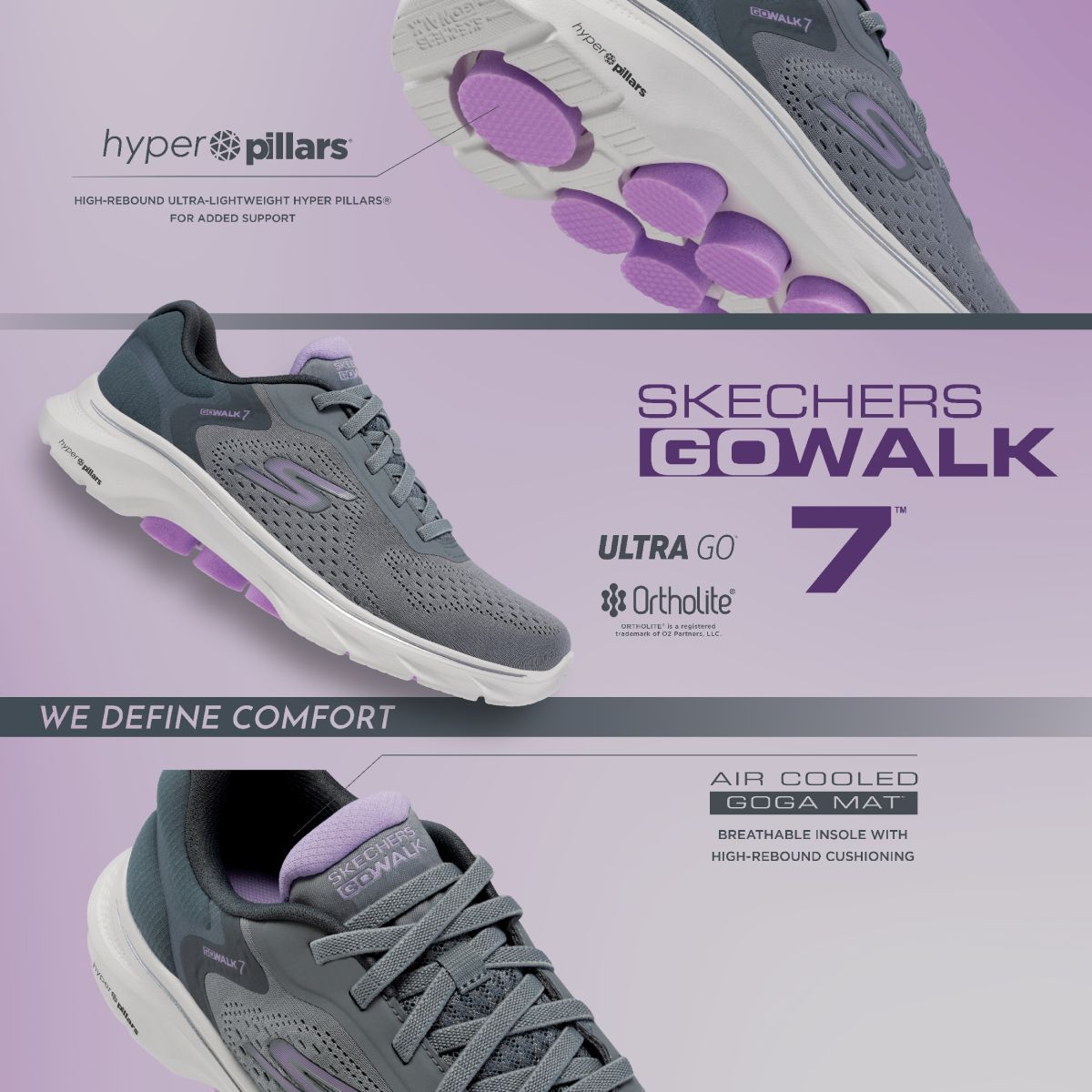 SKECHERS GOWALK 7 รองเท้าเดินที่มากับเทคโนโลยีการออกแบบ Groove Design ที่ให้สัมผัสที่สบายเท้าในทุกๆก้าวของคุณ พร้อมด้วยพื้นรองเท้าชั้นใน Air-Cooled Goga Mat™ มีระบบกันกระแทก ULTRA GO® น้ำหนักเบา และเสริมด้วยเทคโนโลยี Hyper Pillar Technology™ ที่มาพร้อมกับความนุ่มเด้งขณะก้าวเดิน