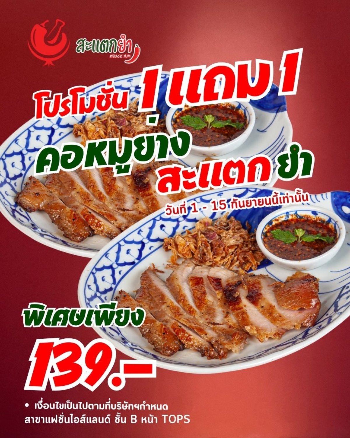 จัดให้ พิเศษ สั่ง “คอหมูย่าง” สะแตกยำ 1 จาน #รับฟรีทันที 1 จาน ในราคาเพียง 139.- เท่านั้น