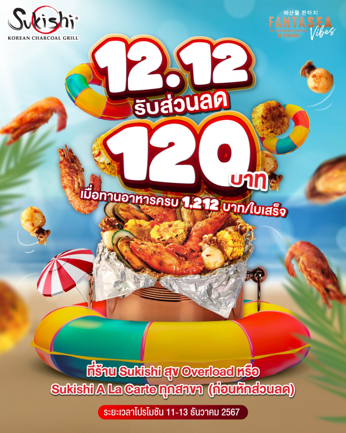 12.12 นี้ ซูกิชิไม่มีพลาด จัดให้แล้วกับโปรโมชันสุดจี๊ด ส่งตรงสด ๆ ถึงหน้าเตา พร้อมกับเมนู FantaSea Vibes ที่จัดหนักจัดเต็มทุกถาด ต้อนรับ 12.12 นี้ โปรโมชันส่วนลด 120 บาท เมื่อทานครบ 1,212 บาท / ใบเสร็จ ฟิน อร่อย สบายกระเป๋า พร้อมฝากท้องไว้กับซูกิชิตลอด 3 วันเต็ม