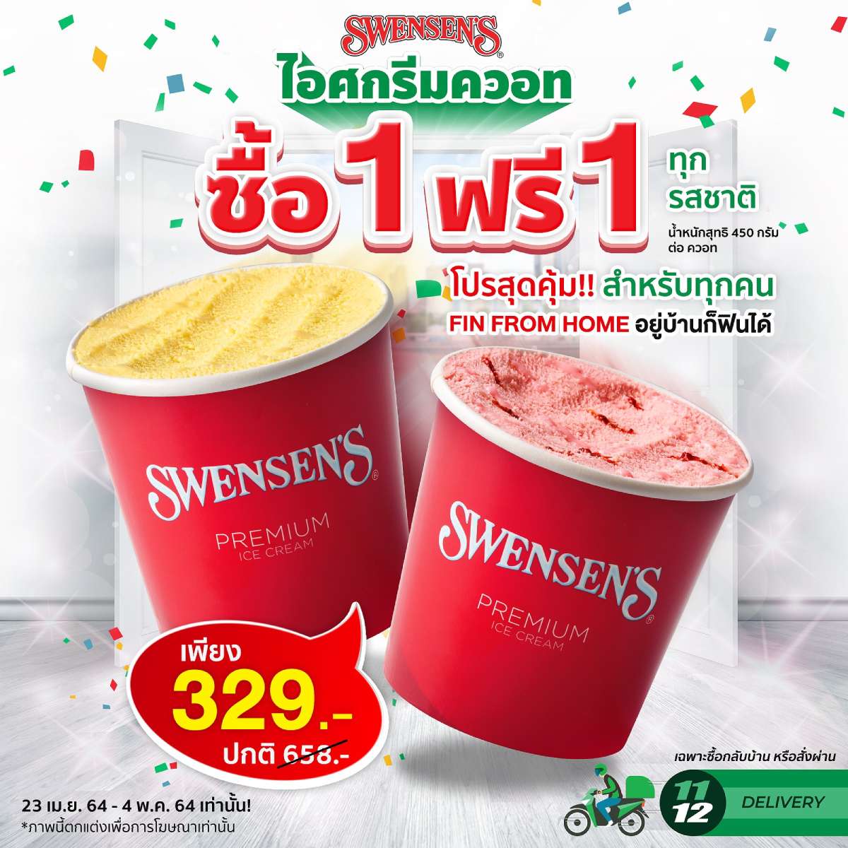 เมื่อสั่งผ่านหน้าร้าน ไอศกรีมควอท 1 ฟรี 1 รสชาติใดก็ได้ (น้ำหนักสุทธิ 450 กรัมต่อควอท) เพียง 329.- (ปกติ 658.-)