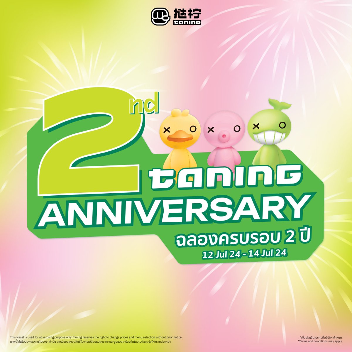 11 Jul 2567It’s someone’s birthday TADA.Celebrating TANING’s birthday month.Let’s celebrate TANING 2nd annuversary with us.Get ready for the exclusive promotions and big surprise with TANING’s special limited gifts.