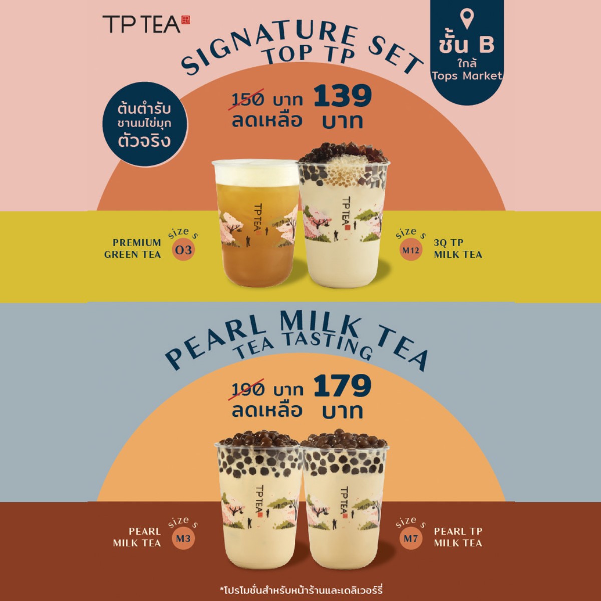 เหลือ139 บาท ได้แก่เมนู (O3) Premium Green Tea เเละ (M12) 3Q TP Milk Tea (Coffee Jelly, Sago, Pearl) - เซ็ตที่สอง “PEARL MILK TEA TASTING” (เฉพาะไซซ์ S) ราคาปกติ 190