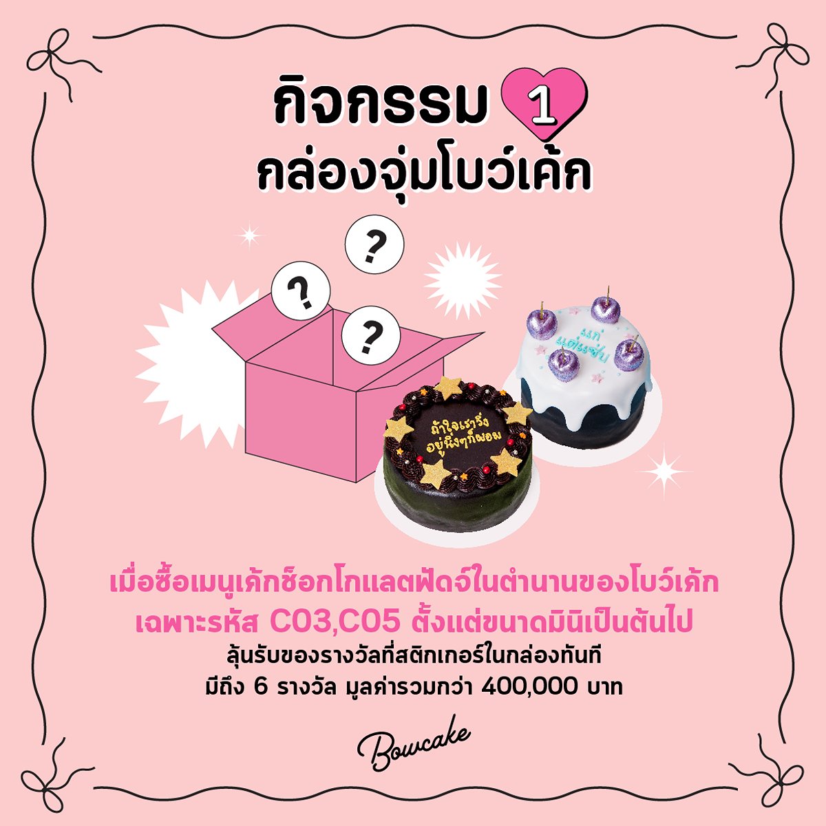 - กิจกรรมที่ 1 : กล่องจุ่มโบว์เค้ก รวม 6 ของรางวัลสุดเซอร์ไพรส์ ลุ้นรับรางวัลที่ 1 สิทธิ์กินเค้กฟรี 1 ปีและพวงกุญแจที่ไม่มีขายที่ไหน Limited สุดๆ