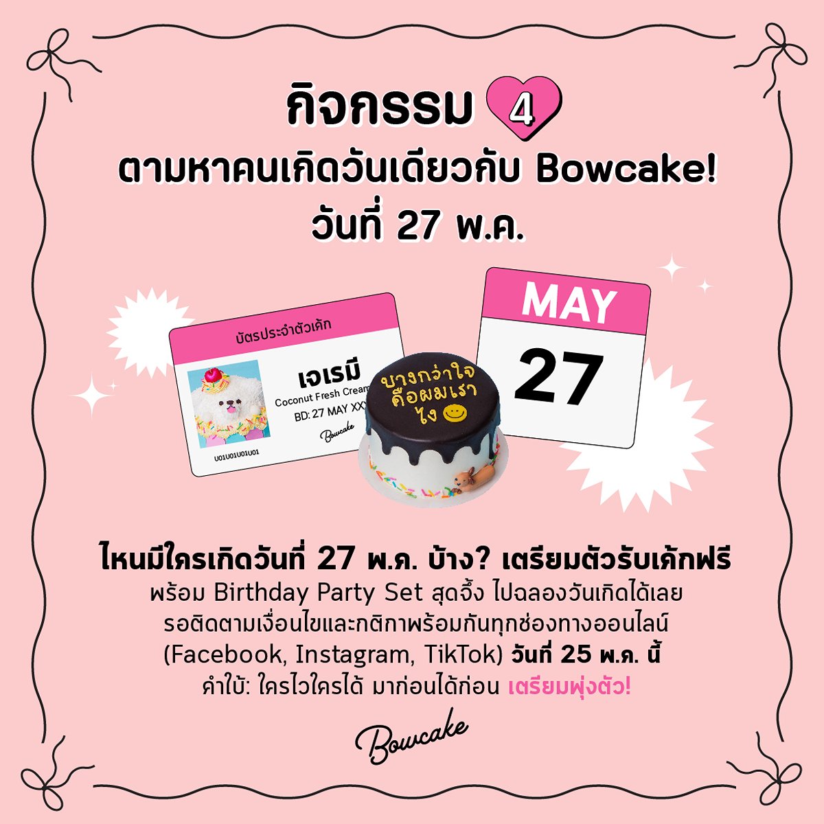 - กิจกรรมที่ 4 – ตามหาคนเกิดวันเดียวกับ Bowcake วันที่ 27 พ.ค. ลุ้นรับเค้กฟรี พร้อม Birthday Party Set สุดจึ้ง ติดตามออนไลน์วันที่ 25 พ.ค. นี้