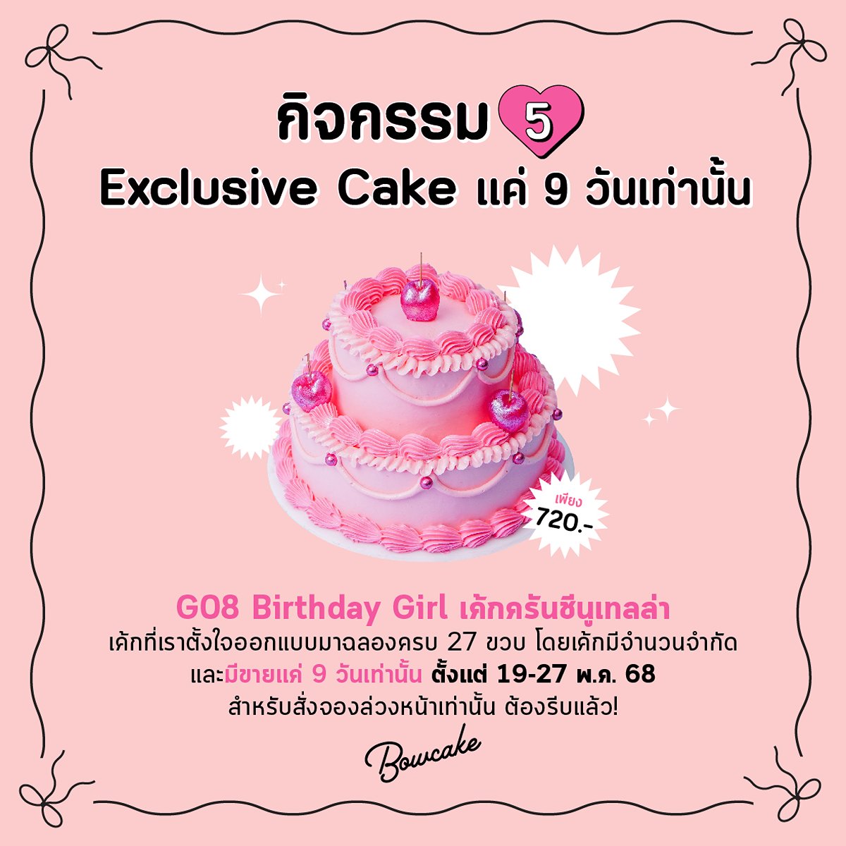 - กิจกรรมที่ 5 – Exclusive Cake G08 Birthday Girl เค้กครันชีนูเทลล่า 720.- เค้กที่เราตั้งใจออกแบบมาฉลองครบ 27 ขวบ มีจำนวนจำกัดและขายแค่ 9 วัน (19-27 พ.ค. 68) สำหรับสั่งจองล่วงหน้าผ่าน LINE OA: @bowcake เท่านั้น